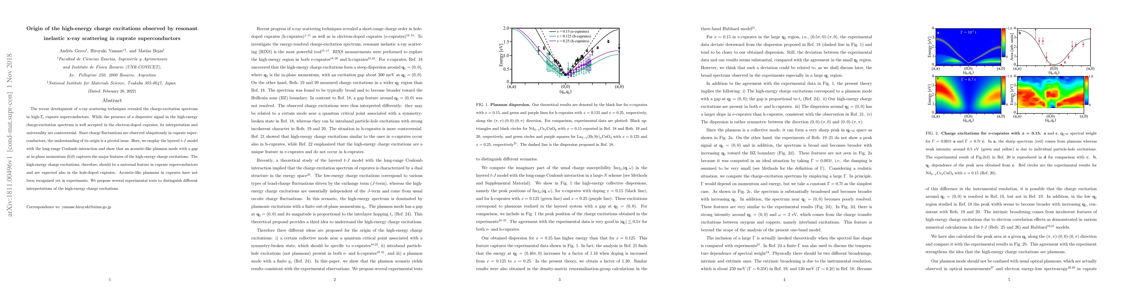 This paper uses the layered $t$-$J$ model to explain the high-energy charge excitations in cuprate superconductors, attributing them to an acoustic-like plasmon mode. It suggests that these excitations are a universal feature in cuprates and proposes experimental tests to validate this interpretation.
