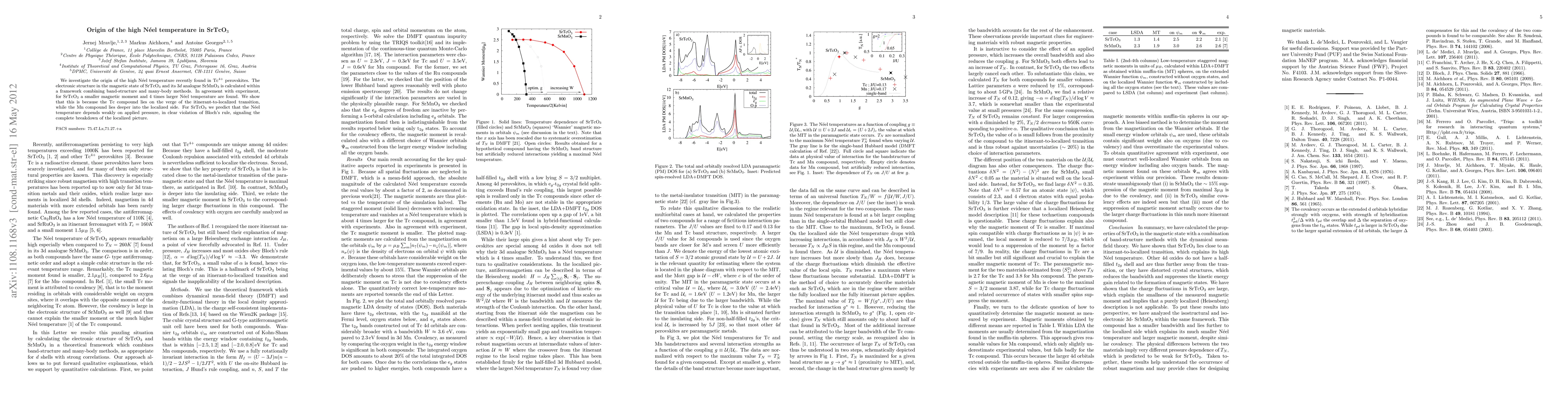 We investigate the origin of the high Neel temperature recently found in Tc perovskites. The electronic structure in the magnetic state of SrTcO3 and its 3d analogue SrMnO3 is calculated within a framework combining band-structure and many-body methods. In agreement with experiment, the Neel temperature of SrTcO3 is found to be four times larger than that of SrMnO3. We show that this is because the Tc-compound lies on the verge of the itinerant-to-localized transition, and also has a larger bandwidth, while the Mn-compound lies deeper into the localized side. For SrTcO3 we predict that the Neel temperature depends weakly on applied pressure, in clear violation of Bloch's rule, signaling the complete breakdown of the localized picture.