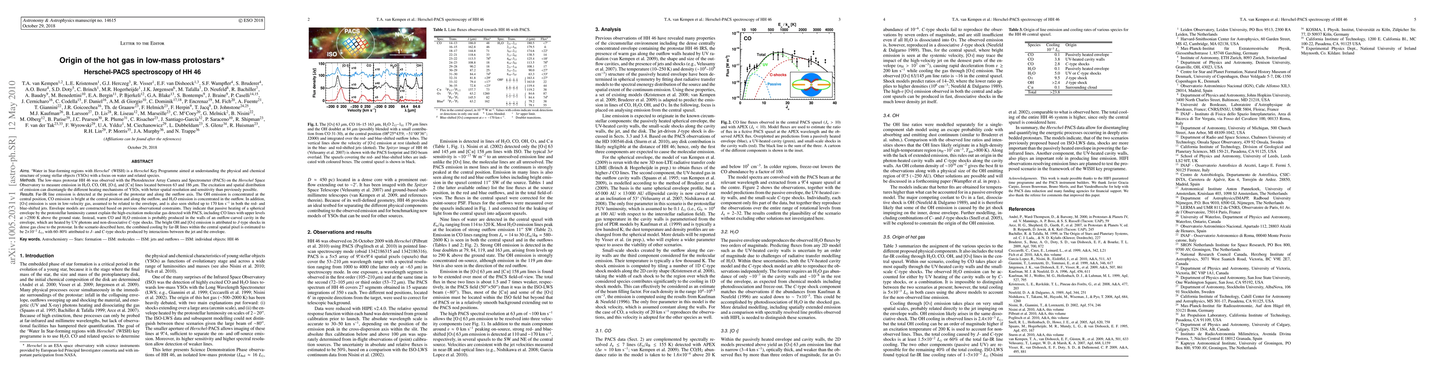 This paper uses Herschel-PACS spectroscopy to study the low-mass protostar HH 46, identifying the origin of its hot gas. The study reveals that high-excitation molecular gas is likely heated by UV photons and shocks in outflow-carved cavity walls rather than passive heating by the protostar.