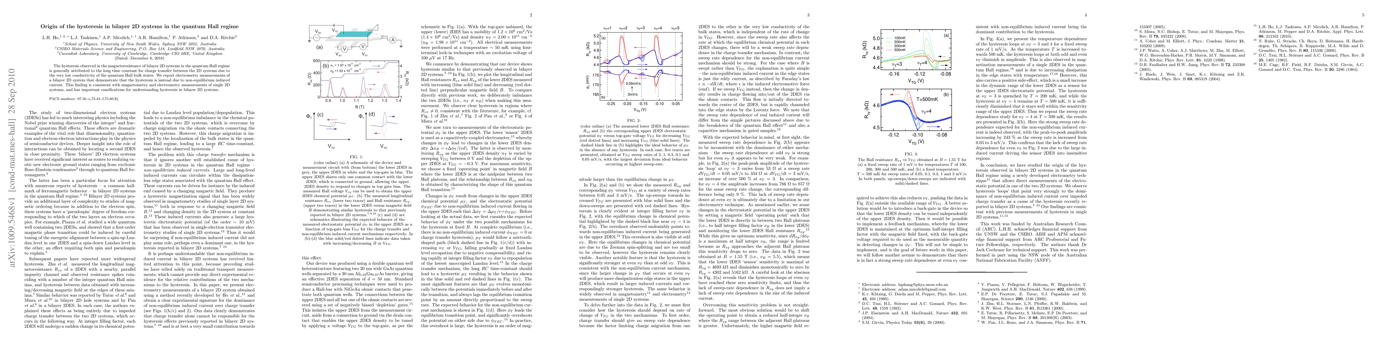 The hysteresis in magnetoresistance of bilayer 2D systems in the quantum Hall regime is caused by non-equilibrium induced current rather than charge transfer, as previously thought. This conclusion is supported by electrometry measurements and has significant implications for understanding hysteresis in such systems.