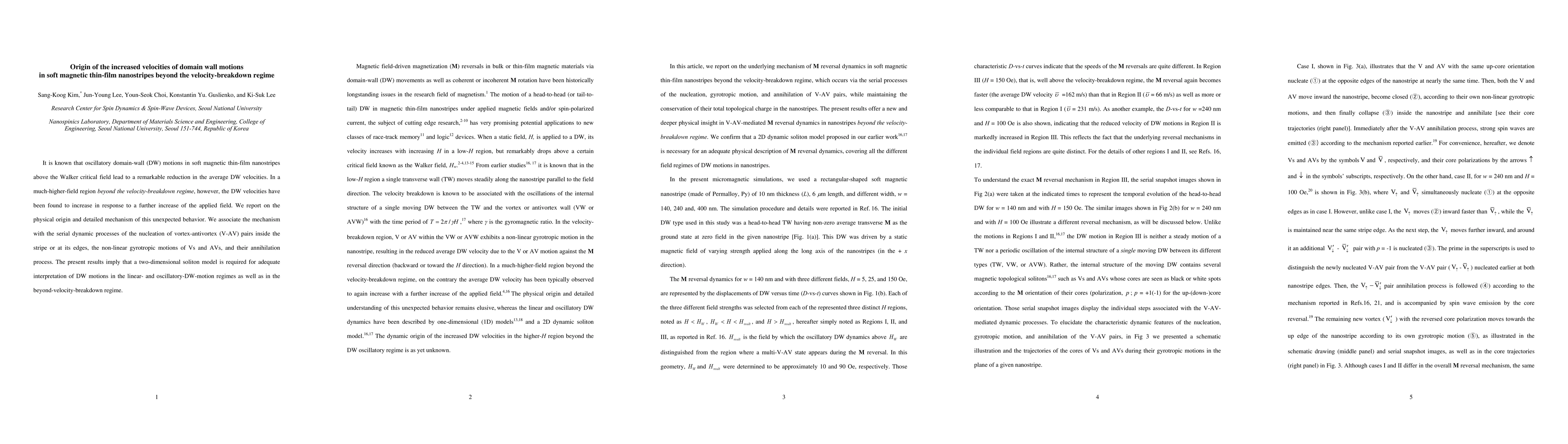 This paper investigates the increased velocities of domain wall motions in soft magnetic thin-film nanostripes beyond the velocity-breakdown regime, attributing the phenomenon to the nucleation and annihilation of vortex-antivortex pairs and their non-linear gyrotropic motions, suggesting a two-dimensional soliton model for comprehensive analysis.