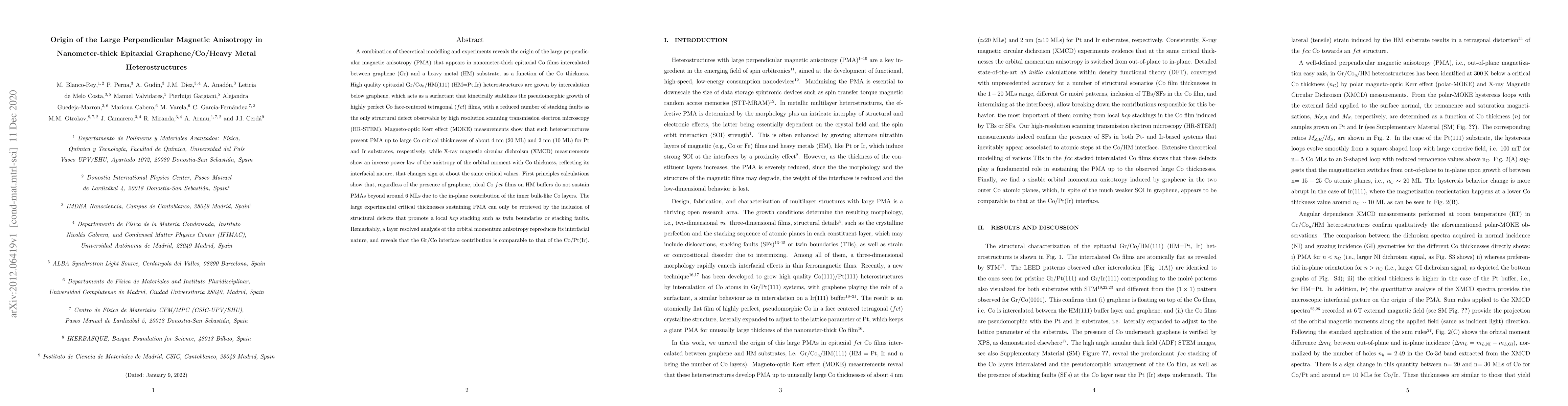 This study combines theoretical modeling and experiments to identify the origin of the large perpendicular magnetic anisotropy in graphene/Co/heavy metal heterostructures. The heterostructures exhibit significant PMA up to 4 nm for Co on Pt and 2 nm for Co on Ir, attributed to the stabilizing effect of graphene and the presence of structural defects promoting local hcp stacking.
