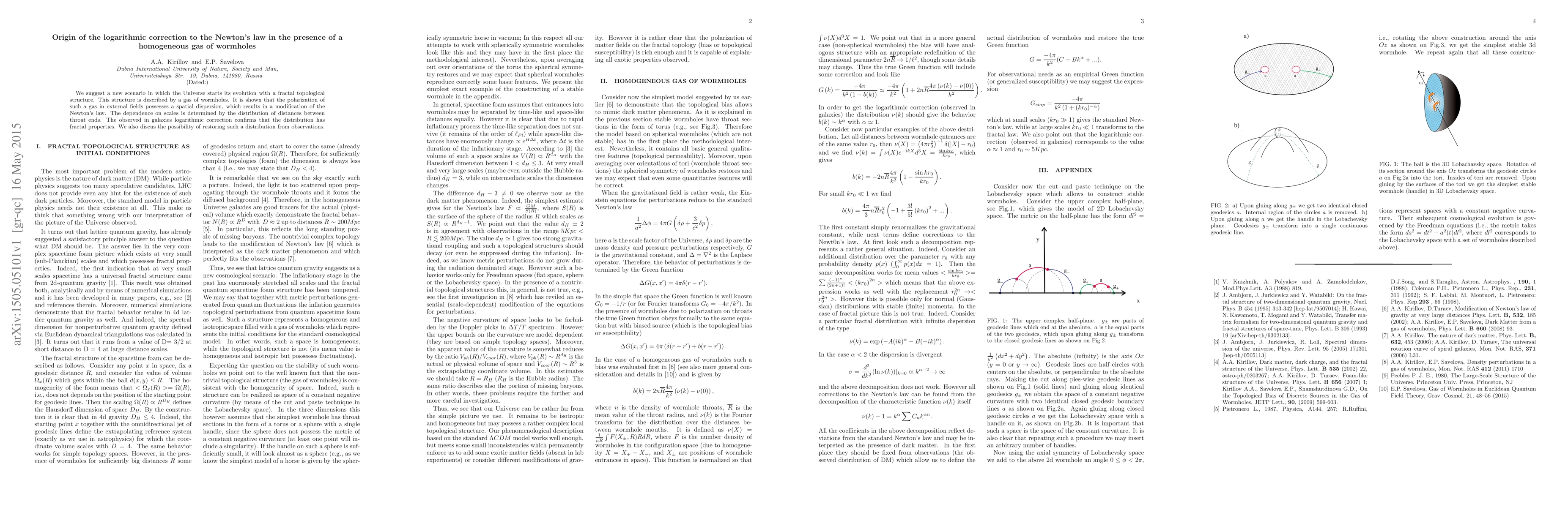 We suggest a new scenario in which the Universe starts its evolution with a fractal topological structure. This structure is described by a gas of wormholes. It is shown that the polarization of such a gas in external fields possesses a spatial dispersion, which results in a modification of the Newton's law. The dependence on scales is determined by the distribution of distances between throat ends. The observed in galaxies logarithmic correction confirms that the distribution has fractal properties. We also discus the possibility of restoring such a distribution from observations.