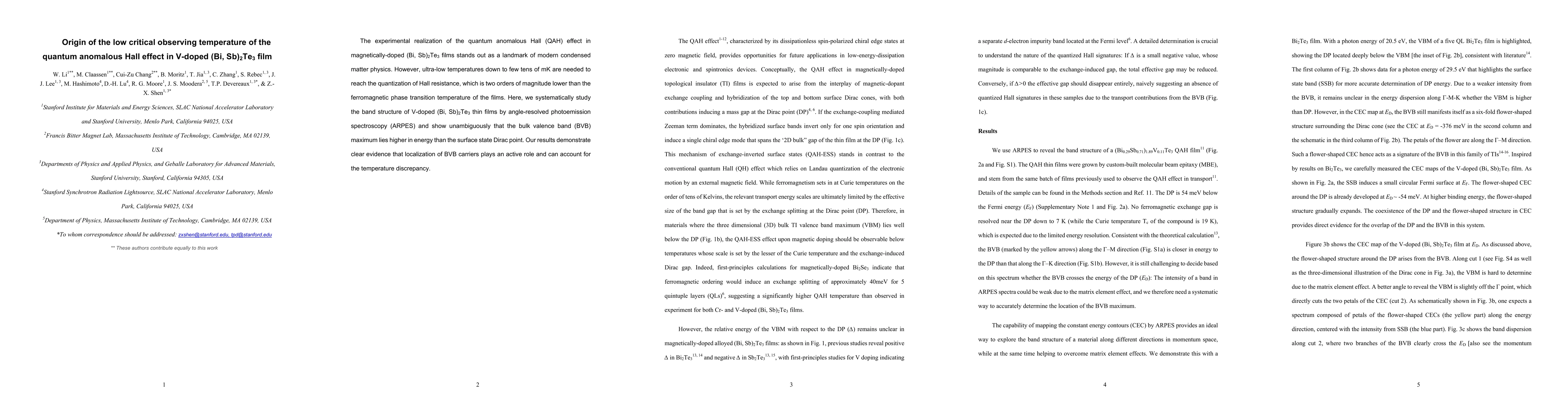 The experimental realization of the quantum anomalous Hall (QAH) effect in magnetically-doped (Bi, Sb)2Te3 films stands out as a landmark of modern condensed matter physics. However, ultra-low temperatures down to few tens of mK are needed to reach the quantization of Hall resistance, which is two orders of magnitude lower than the ferromagnetic phase transition temperature of the films. Here, we systematically study the band structure of V-doped (Bi, Sb)2Te3 thin films by angle-resolved photoemission spectroscopy (ARPES) and show unambiguously that the bulk valence band (BVB) maximum lies higher in energy than the surface state Dirac point. Our results demonstrate clear evidence that localization of BVB carriers plays an active role and can account for the temperature discrepancy.