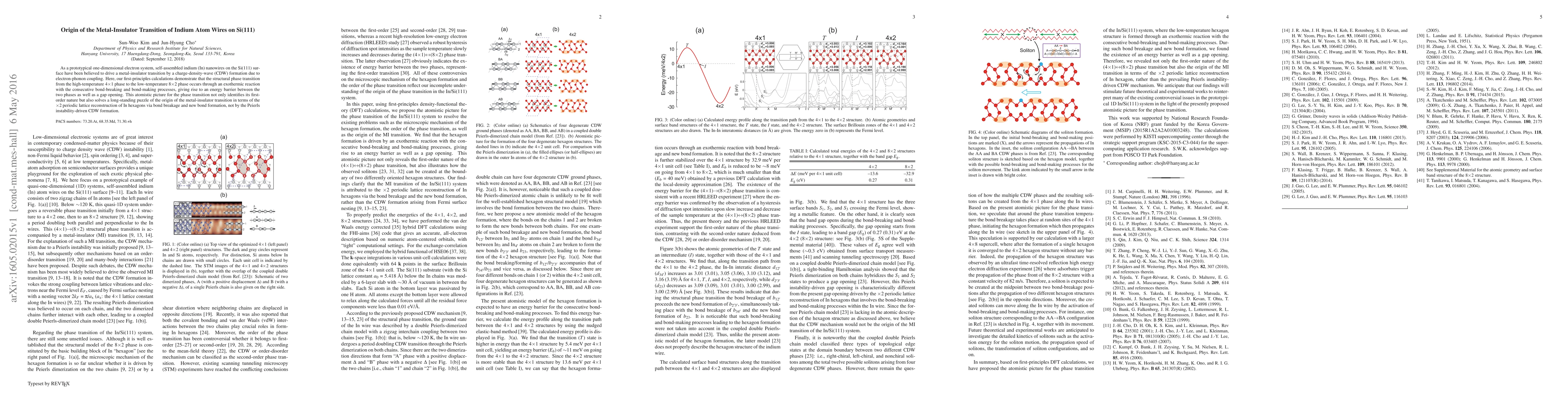 This study reveals the metal-insulator transition in indium nanowires on Si(111) occurs via a structural phase change involving bond breakage and formation, rather than charge-density wave formation. The transition is identified as first-order with an energy barrier, explaining the transition's origin through lattice reconstruction.