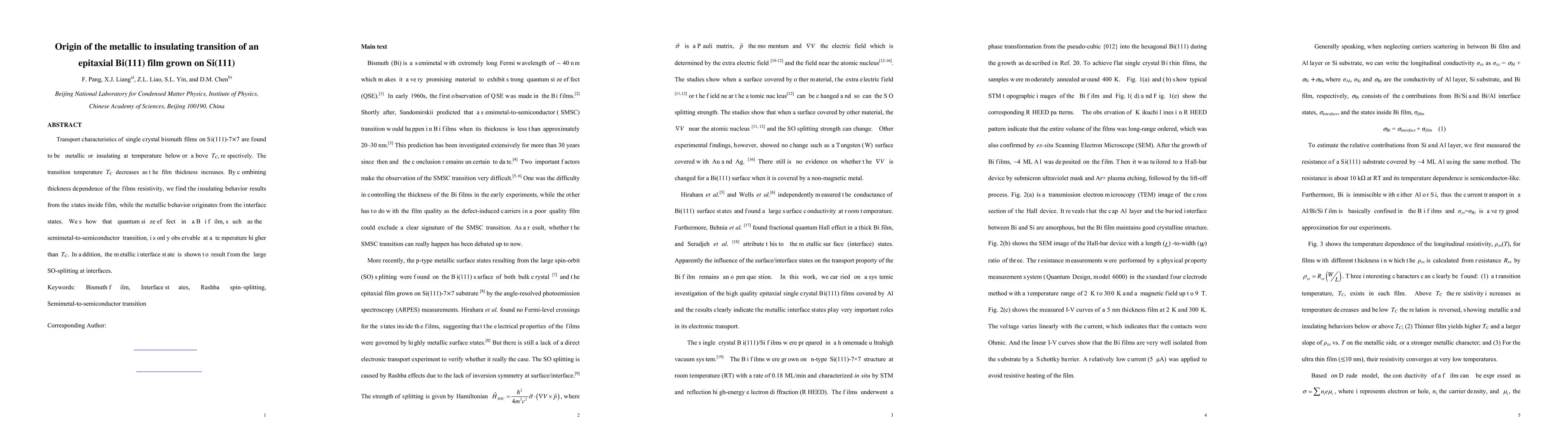Transport characteristics of single crystal bismuth films on Si(111)-7 \times 7 are found to be metallic or insulating at temperature below or above TC, respectively. The transition temperature TC decreases as the film thickness increases. By combining thickness dependence of the films resistivity, we find the insulating behavior results from the states inside film, while the metallic behavior originates from the interface states. We show that quantum size effect in a Bi film, such as the semimetal-to-semiconductor transition, is only observable at a temperature higher than TC. In addition, the metallic interface state is shown to result from the large SO-splitting at interfaces.