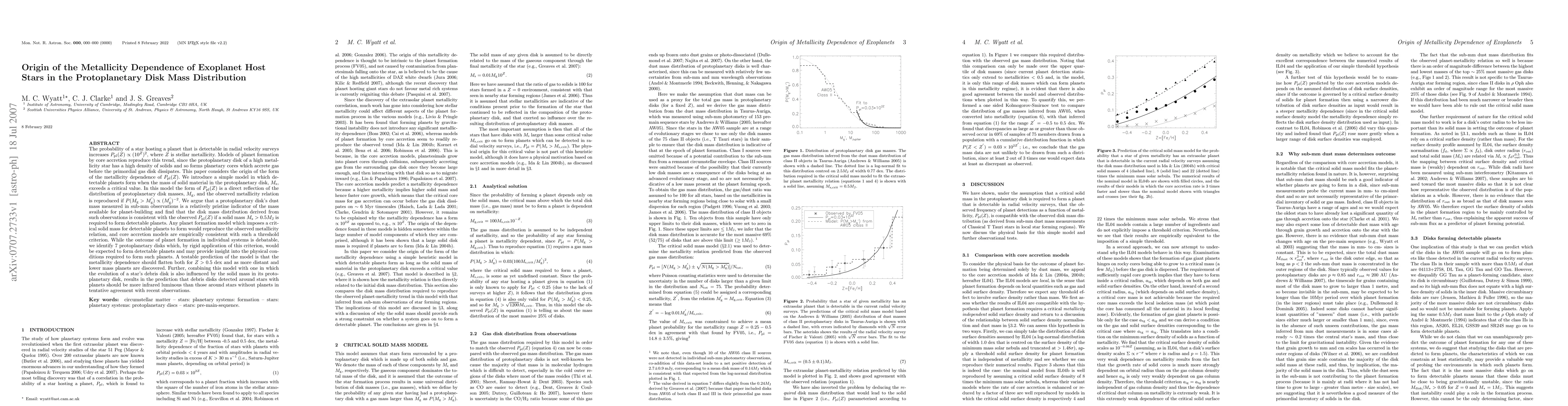 The probability of a star hosting a planet that is detectable in radial velocity surveys increases Ppl(Z) oc 10^2Z, where Z is metallicity. Core accretion models reproduce this trend, since the protoplanetary disk of a high metallicity star has a high density of solids and so forms cores which accrete gas before the primordial gas disk dissipates. This paper considers the origin of the form of Ppl(Z). We introduce a simple model in which detectable planets form when the mass of solids in the protoplanetary disk, Ms, exceeds a critical value. In this model the form of Ppl(Z) is a direct reflection of the distribution of protoplanetary disk masses, Mg, and the observed Ppl(Z) is reproduced if P(Mg>Mg') oc 1/Mg'^2. We argue that a protoplanetary disk's sub-mm dust mass is a pristine indicator of the mass available for planet-building and find the observed sub-mm disk mass distribution is consistent with the observed Ppl(Z) if Ms>0.5M_J is required to form detectable planets. Any planet formation model which imposes a critical solid mass for planet formation would reproduce the observed Ppl(Z), and core accretion models are empirically consistent with a threshold criterion. We identify 7 protoplanetary disks which, by rigid application of this criterion, would be expected to form detectable planets. A testable prediction is that Ppl(Z) should flatten both for Z>0.5dex and as more distant and lower mass planets are discovered. Further, combining this model with one in which the evolution of a star's debris disk is also influenced by the solid mass in its protoplanetary disk, results in the prediction that debris disks detected around stars with planets should be more infrared luminous than those around stars without planets in tentative agreement with recent observations.