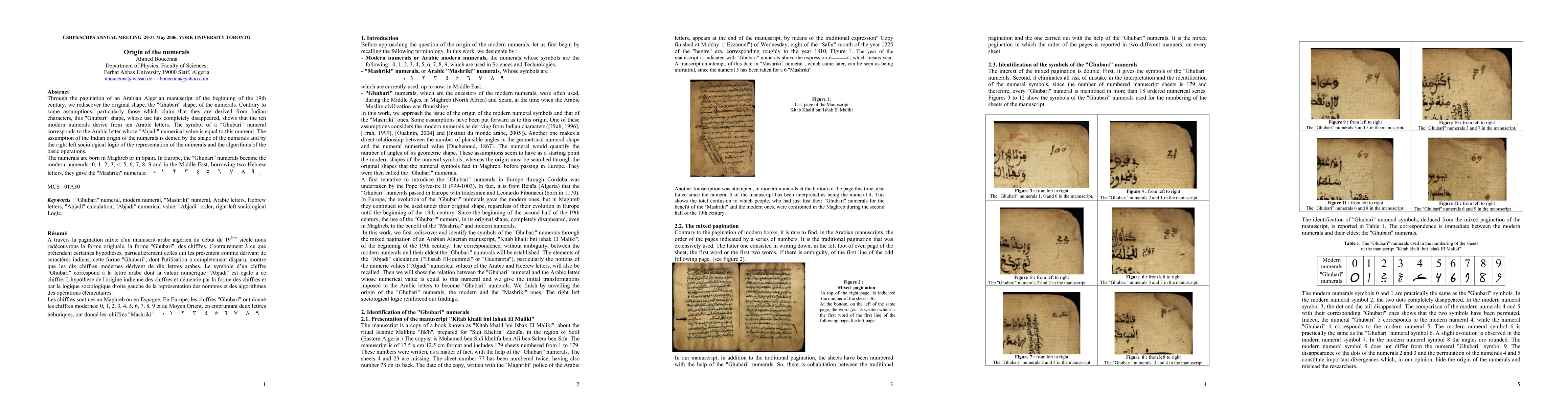 Through the pagination of an Arabian Algerian manuscript of the beginning of the 19th century, we rediscover the original shape, the "Ghubari" shape, of the numerals. Contrary to some assumptions, particularly those which claim that they are derived from Indian characters, this "Ghubari" shape, whose use has completely disappeared, shows that the ten modern numerals derive from ten Arabic letters. The symbol of a "Ghubari" numeral corresponds to the Arabic letter whose "Abjadi" numerical value is equal to this numeral. The assumption of the Indian origin of the numerals is denied by the shape of the numerals and by the right left sociological logic of the representation of the numerals and the algorithms of the basic operations. The numerals are born in Maghreb or in Spain. In Europe, the "Ghubari" numerals became the modern numerals: 0, 1, 2, 3, 4, 5, 6, 7, 8, 9 and in the Middle East, borrowing two Hebrew letters, they gave the "Mashriki" numerals: ۰ ۱ ۲ ۳ ٩ ٨ ٧ ٦ ٥ ٤ .
