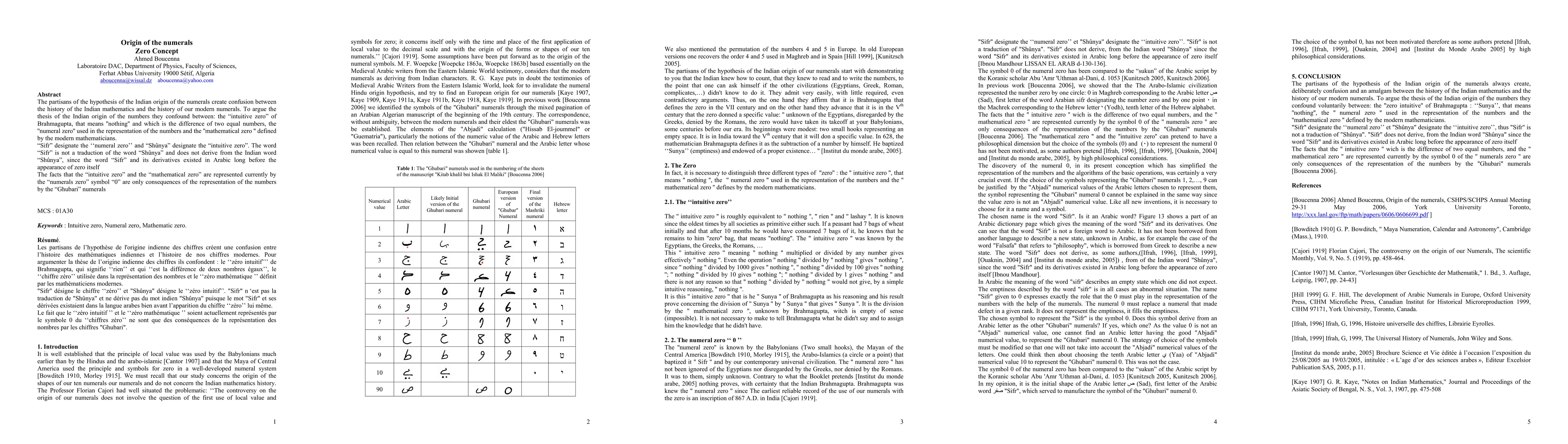 The partisans of the hypothesis of the Indian origin of the numerals create confusion between the history of the Indian mathematics and the history of our modern numerals. To argue the thesis of the Indian origin of the numbers they confound between: the "intuitive zero " of Brahmagupta, that means ''nothing'' and which is the difference of two equal numbers, the "numeral zero" used in the representation of the numbers and the "mathematical zero" defined by the modern mathematicians. "Sifr" designate the "numeral zero" and "Shunya" designate the "intuitive zero". The word "Sifr" is not a traduction of the word "Shunya" and does not derive from the Indian word "Shunya", since the word "Sifr" and its derivatives existed in Arabic long before the appearance of zero itself The facts that the "intuitive zero" and the "mathematical zero" are represented currently by the "numerals zero" symbol "0" are only consequences of the representation of the numbers by the "Ghubari" numerals