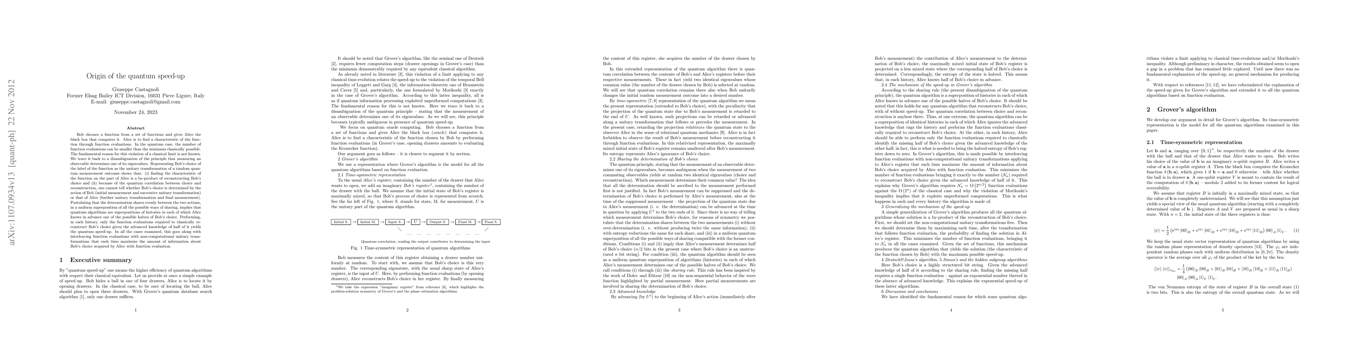 The paper traces the origin of quantum speed-up to the ambiguity in measurement outcomes of commuting observables, proposing a superposition of histories where Alice knows half of Bob's choice in advance, enabling fewer function evaluations.
