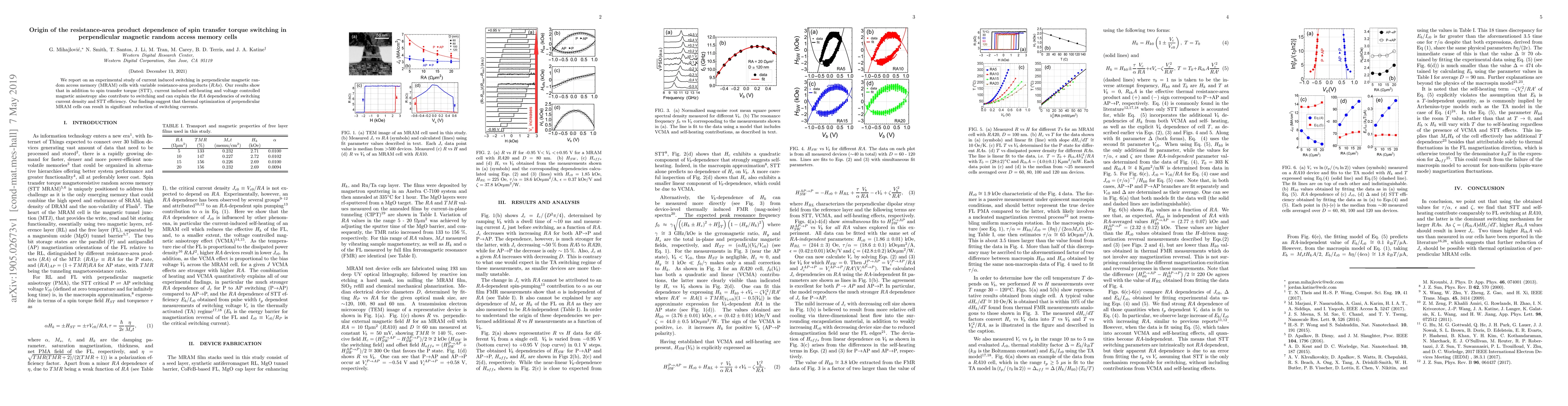 This study investigates the role of resistance-area product in current-induced switching of perpendicular MRAM cells, revealing contributions from spin transfer torque, self-heating, and voltage-controlled magnetic anisotropy. Thermal optimization of these cells can significantly lower switching currents.