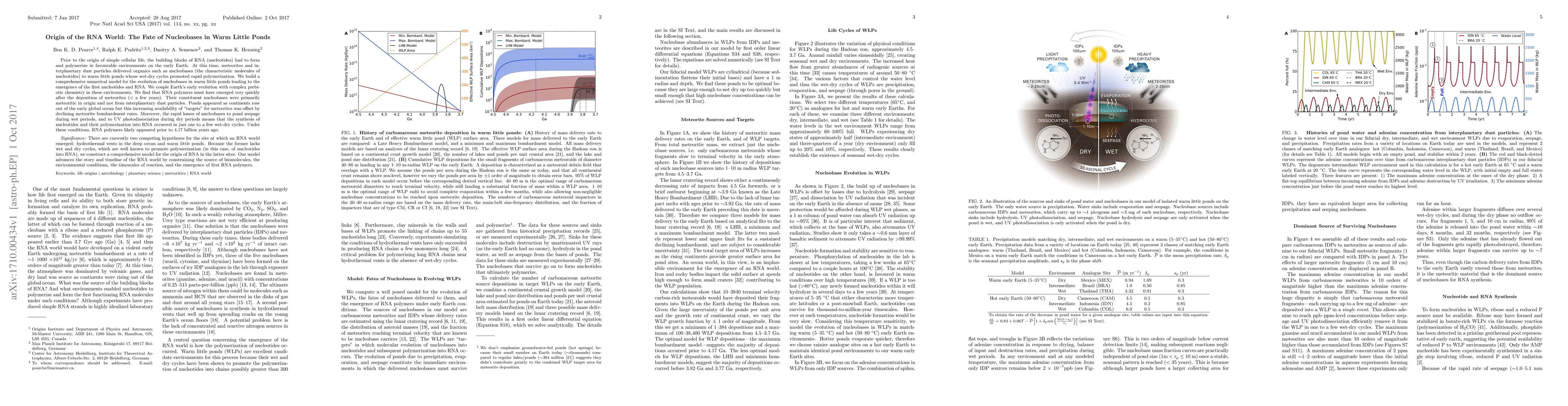 This paper develops a numerical model to investigate the conditions and timing for the emergence of the RNA world, showing that warm little ponds on early Earth, facilitated by meteorite-delivered nucleobases and wet-dry cycles, were likely the site for rapid RNA polymerization, occurring within a few wet-dry cycles and before 4.17 billion years ago. The model supports the hypothesis that these ponds, rather than hydrothermal vents, were the cradle for the first RNA molecules.