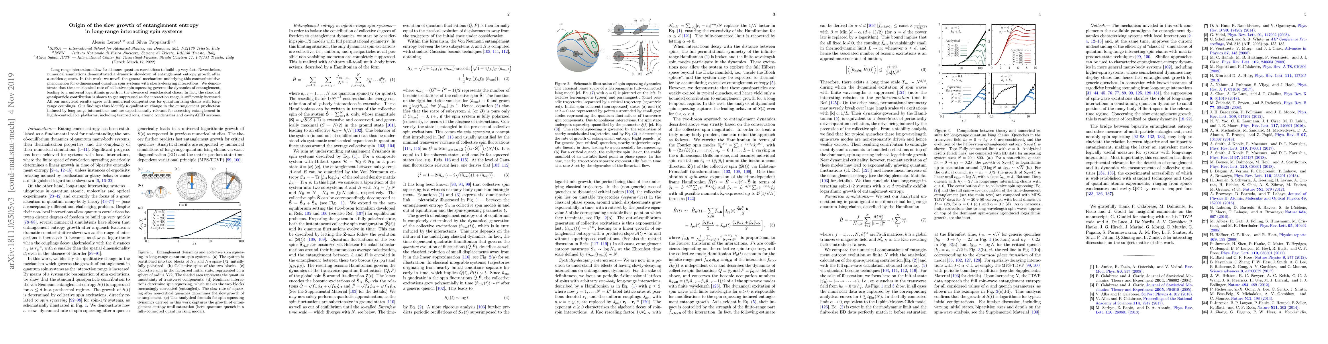 This paper investigates the slow growth of entanglement entropy in long-range interacting spin systems post-quench, revealing that collective spin squeezing governs the dynamics, leading to universal logarithmic growth. The study finds that the quasiparticle contribution diminishes with increased interaction range, aligning with numerical simulations for quantum Ising chains.