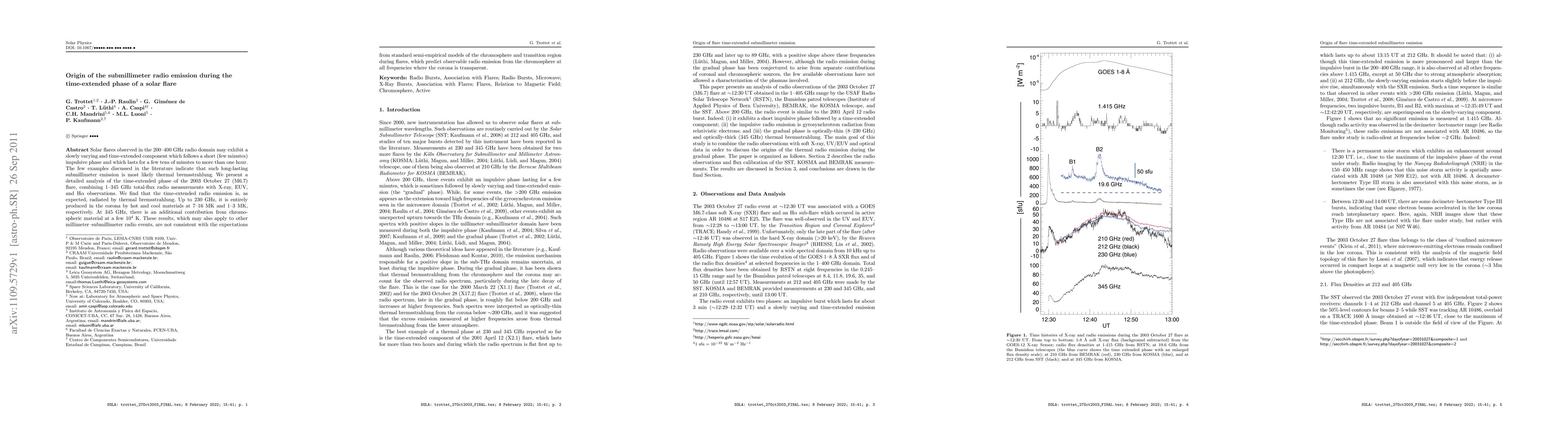 Solar flares observed in the 200-400 GHz radio domain may exhibit a slowly varying and time-extended component which follows a short (few minutes) impulsive phase and which lasts for a few tens of minutes to more than one hour. The few examples discussed in the literature indicate that such long-lasting submillimeter emission is most likely thermal bremsstrahlung. We present a detailed analysis of the time-extended phase of the 2003 October 27 (M6.7) flare, combining 1-345 GHz total-flux radio measurements with X-ray, EUV, and H{\alpha} observations. We find that the time-extended radio emission is, as expected, radiated by thermal bremsstrahlung. Up to 230 GHz, it is entirely produced in the corona by hot and cool materials at 7-16 MK and 1-3 MK, respectively. At 345 GHz, there is an additional contribution from chromospheric material at a few 10^4 K. These results, which may also apply to other millimeter-submillimeter radio events, are not consistent with the expectations from standard semi-empirical models of the chromosphere and transition region during flares, which predict observable radio emission from the chromosphere at all frequencies where the corona is transparent.