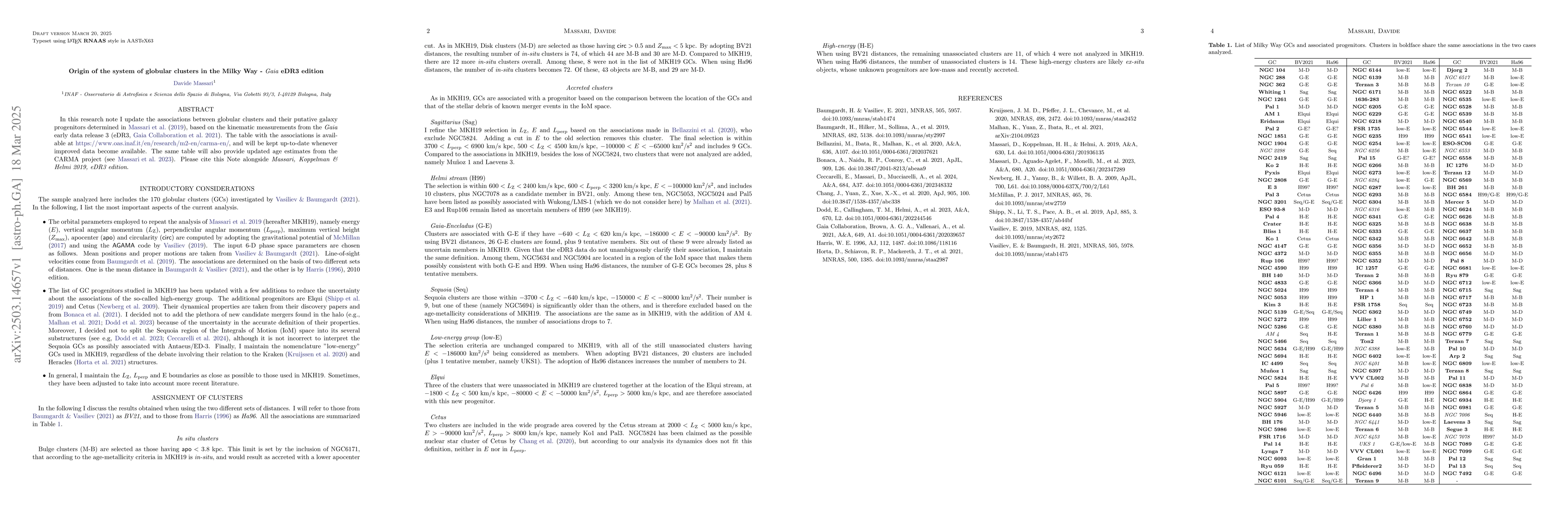 The research introduces an updated table with associations between GCs and their progenitors, utilizing Gaia eDR3 kinematic measurements and improved distance estimates, providing a valuable resource for future studies.
