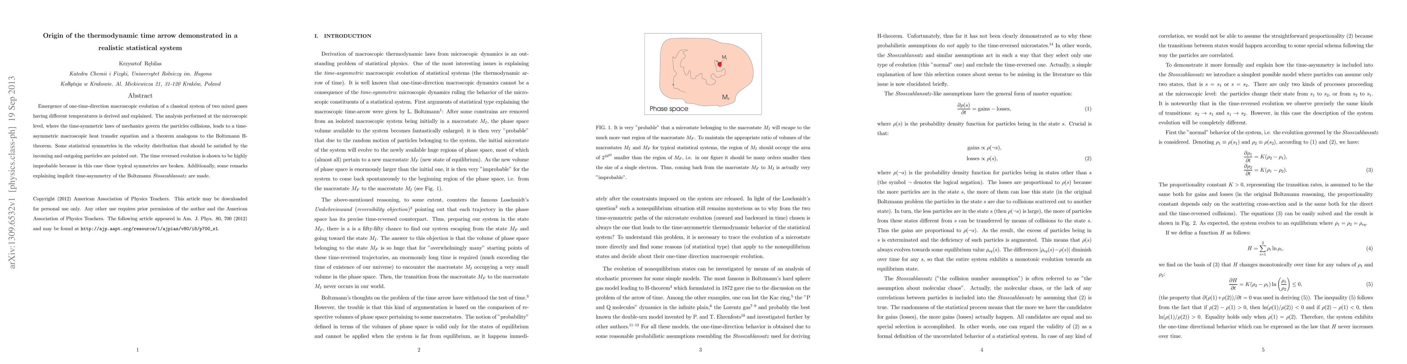 Emergence of one-time-direction macroscopic evolution of a classical system of two mixed gases having different temperatures is derived and explained. The analysis performed at the microscopic level, where the time-symmetric laws of mechanics govern the particles collisions, leads to a time-asymmetric macroscopic heat transfer equation and a theorem analogous to the Boltzmann H-theorem. Some statistical symmetries in the velocity distribution that should be satisfied by the incoming and outgoing particles are pointed out. The time reversed evolution is shown to be highly improbable because in this case these typical symmetries are broken. Additionally, some remarks explaining implicit time-asymmetry of the Boltzmann \emph{Stosszahlansatz} are made.