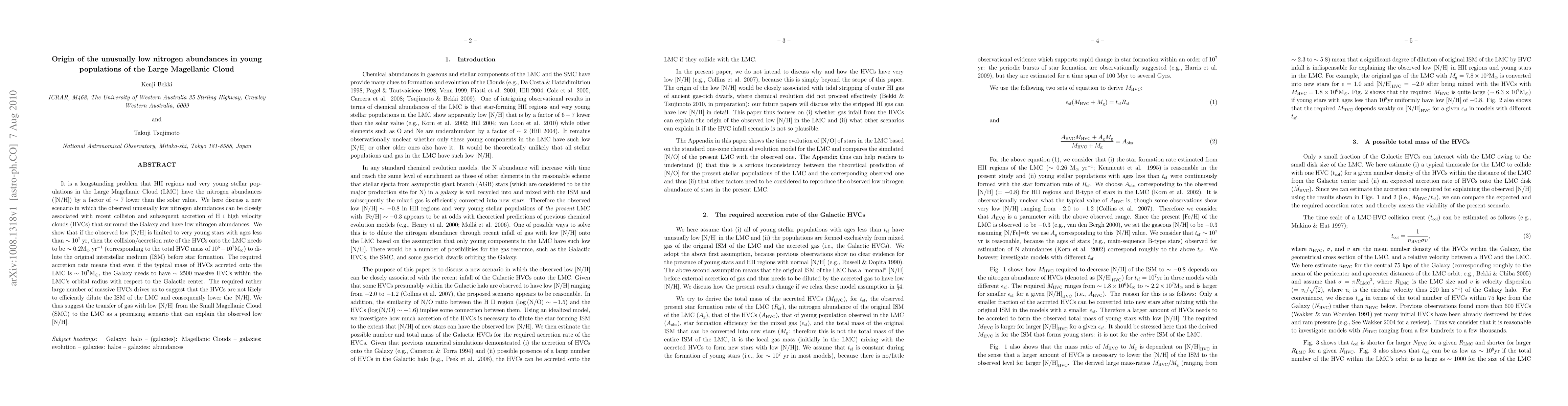 It is a longstanding problem that HII regions and very young stellar populations in the Large Magellanic Cloud (LMC) have the nitrogen abundances ([N/H]) by a factor of ~7 lower than the solar value. We here discuss a new scenario in which the observed unusually low nitrogen abundances can be closely associated with recent collision and subsequent accretion of HI high velocity clouds (HVCs) that surround the Galaxy and have low nitrogen abundances. We show that if the observed low [N/H] is limited to very young stars with ages less than ~10^7 yr, then the collision/accretion rate of the HVCs onto the LMC needs to be ~ 0.2 M_sun/yr (corresponding to the total HVC mass of 10^6-10^7 M_sun) to dilute the original interstellar medium (ISM) before star formation. The required accretion rate means that even if the typical mass of HVCs accreted onto the LMC is ~ 10^7 M_sun, the Galaxy needs to have ~2500 massive HVCs within the LMC's orbital radius with respect to the Galactic center. The required rather large number of massive HVCs drives us to suggest that the HVCs are not likely to efficiently dilute the ISM of the LMC and consequently lower the [N/H]. We thus suggest the transfer of gas with low [N/H] from the Small Magellanic Cloud (SMC) to the LMC as a promising scenario that can explain the observed low [N/H].
