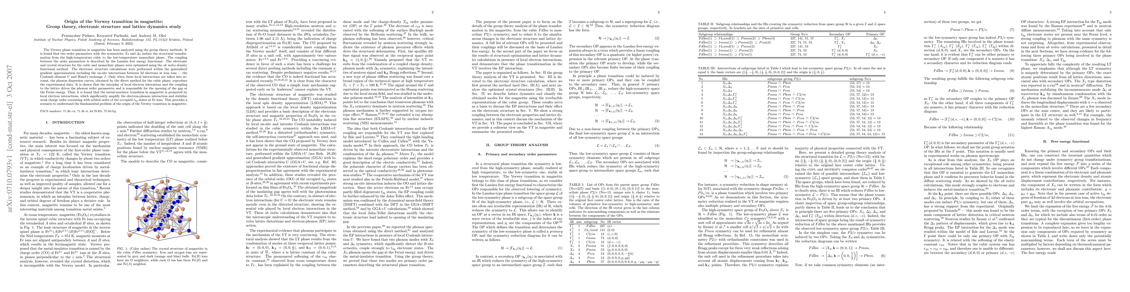 This study uses group theory and {\it ab initio} density functional methods to analyze the Verwey transition in magnetite, identifying two order parameters that induce the structural phase change. Local electron interactions and lattice coupling are crucial for the metal-insulator transition, explaining the transition's origin.