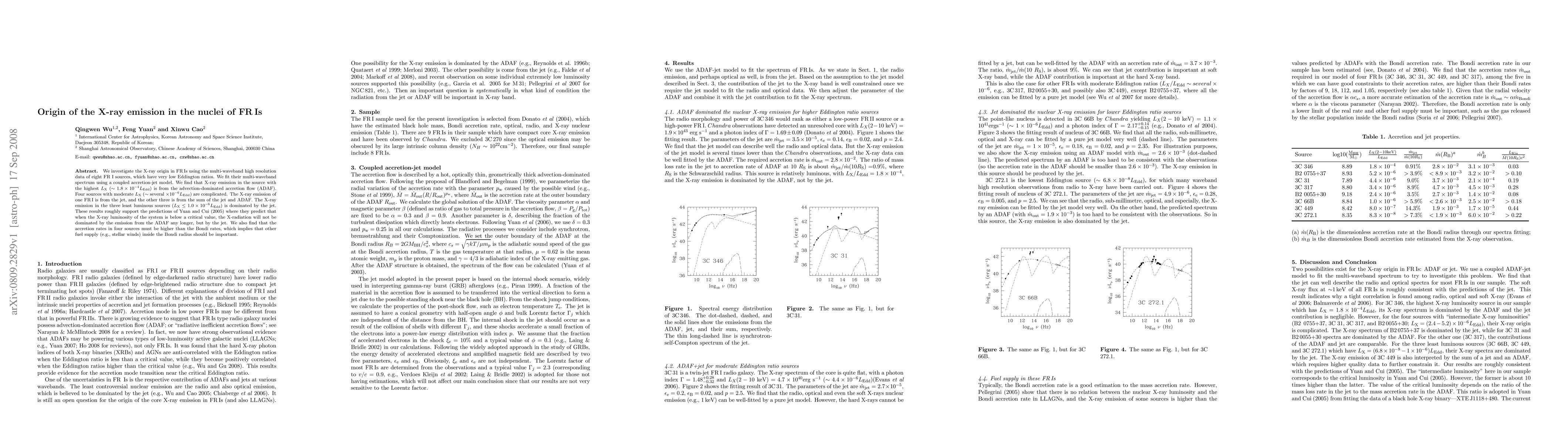 We investigate the X-ray origin in FRIs using the multi-waveband high resolution data of eight FR I sources, which have very low Eddington ratios. We fit their multi-waveband spectrum using a coupled accretion-jet model. We find that X-ray emission in the source with the highest L_X (~1.8*10^-4 L_Edd) is from the advection-dominated accretion flow (ADAF). Four sources with moderate L_X(~several*10^-6 L_Edd) are complicated. The X-ray emission of one FR I is from the jet, and the other three is from the sum of the jet and ADAF. The X-ray emission in the three least luminous sources (L_X<1.0*10^-6L_Edd) is dominated by the jet. These results roughly support the predictions of Yuan and Cui(2005) where they predict that when the X-ray luminosity of the system is below a critical value, the X-radiation will not be dominated by the emission from the ADAF any longer, but by the jet. We also find that the accretion rates in four sources must be higher than the Bondi rates, which implies that other fuel supply (e.g., stellar winds) inside the Bondi radius should be important.