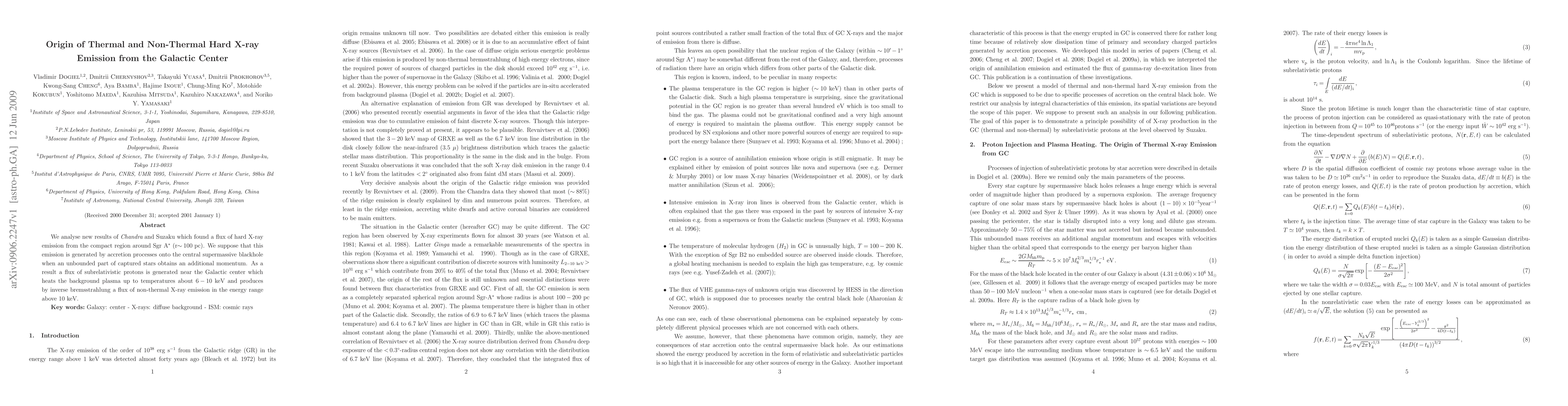 We analyse new results of Chandra and Suzaku which found a flux of hard X-ray emission from the compact region around Sgr A$^\ast$ (r ~ 100 pc). We suppose that this emission is generated by accretion processes onto the central supermassive blackhole when an unbounded part of captured stars obtains an additional momentum. As a result a flux of subrelativistic protons is generated near the Galactic center which heats the background plasma up to temperatures about 6-10 keV and produces by inverse bremsstrahlung a flux of non-thermal X-ray emission in the energy range above 10 keV.