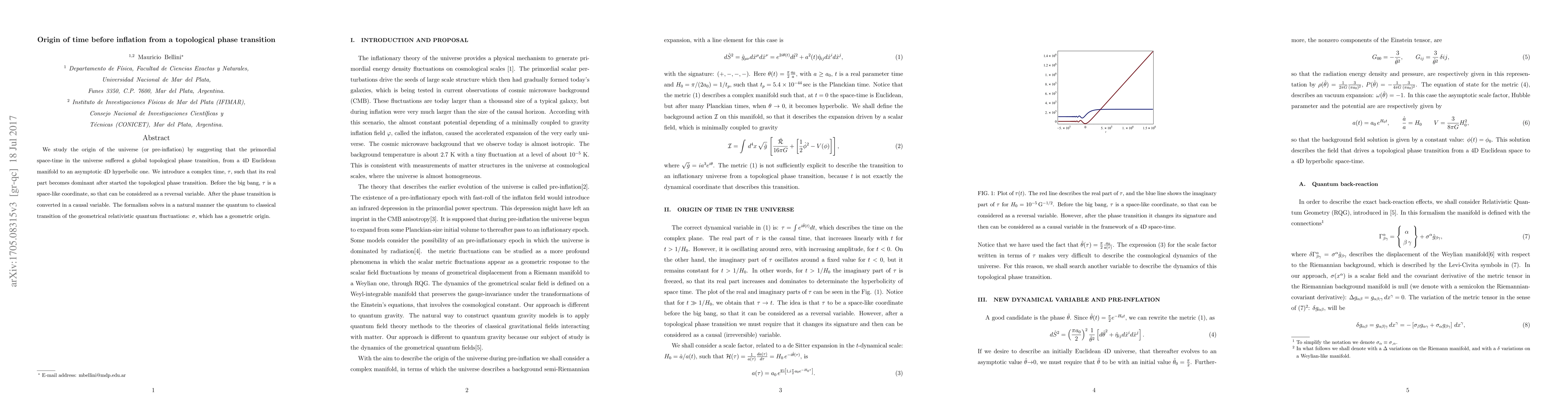 We study the origin of the universe (or pre-inflation) by suggesting that the primordial space-time in the universe suffered a global topological phase transition, from a 4D Euclidean manifold to an asymptotic 4D hyperbolic one. We introduce a complex time, $\tau$, such that its real part becomes dominant after started the topological phase transition. Before the big bang, $\tau$ is a space-like coordinate, so that can be considered as a reversal variable. After the phase transition is converted in a causal variable. The formalism solves in a natural manner the quantum to classical transition of the geometrical relativistic quantum fluctuations: $\sigma$, which has a geometric origin.