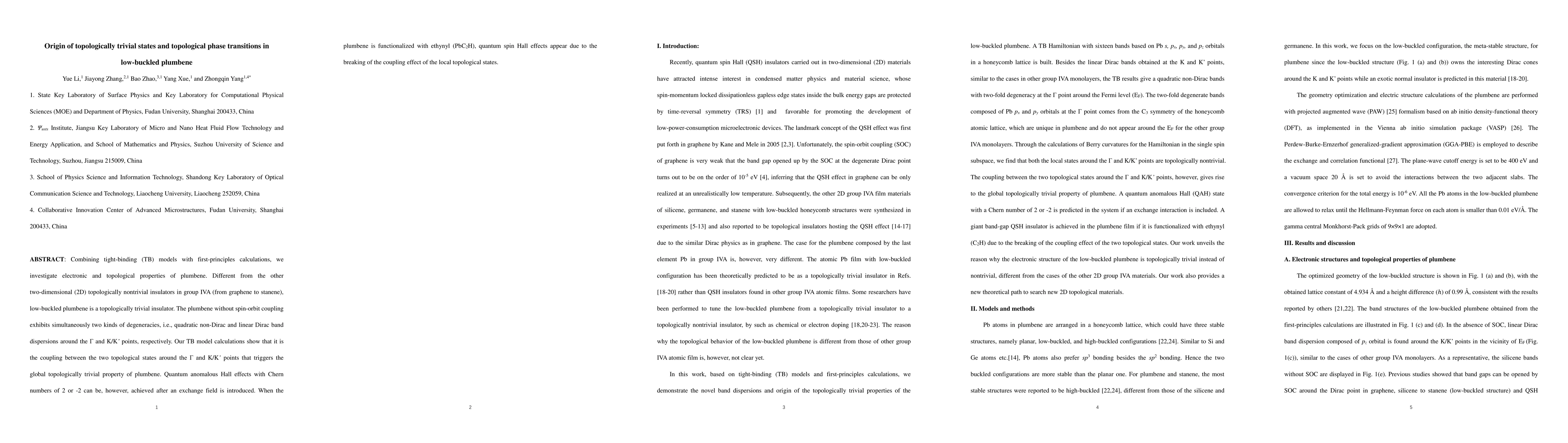 Combining tight-binding (TB) models with first-principles calculations, we investigate electronic and topological properties of plumbene. Different from the other two-dimensional (2D) topologically nontrivial insulators in group IVA (from graphene to stanene), low-buckled plumbene is a topologically trivial insulator. The plumbene without spin-orbit coupling exhibits simultaneously two kinds of degeneracies, i.e., quadratic non-Dirac and linear Dirac band dispersions around the \Gamma and K/K' points, respectively. Our TB model calculations show that it is the coupling between the two topological states around the \Gamma and K/K' points that triggers the global topologically trivial property of plumbene. Quantum anomalous Hall effects with Chern numbers of 2 or -2 can be, however, achieved after an exchange field is introduced. When the plumbene is functionalized with ethynyl (PbC2H), quantum spin Hall effects appear due to the breaking of the coupling effect of the local topological states.