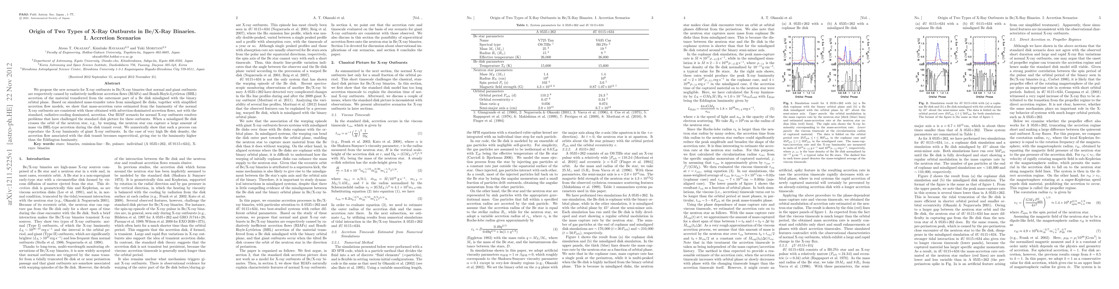 This paper proposes a new scenario for X-ray outbursts in Be/X-ray binaries, suggesting that normal outbursts arise from radiatively inefficient accretion flows (RIAFs) and giant outbursts from Bondi-Hoyle-Lyttleton accretion during disk transit events. The study resolves issues with the standard disk model and shows that giant outbursts can achieve supercritical accretion rates.