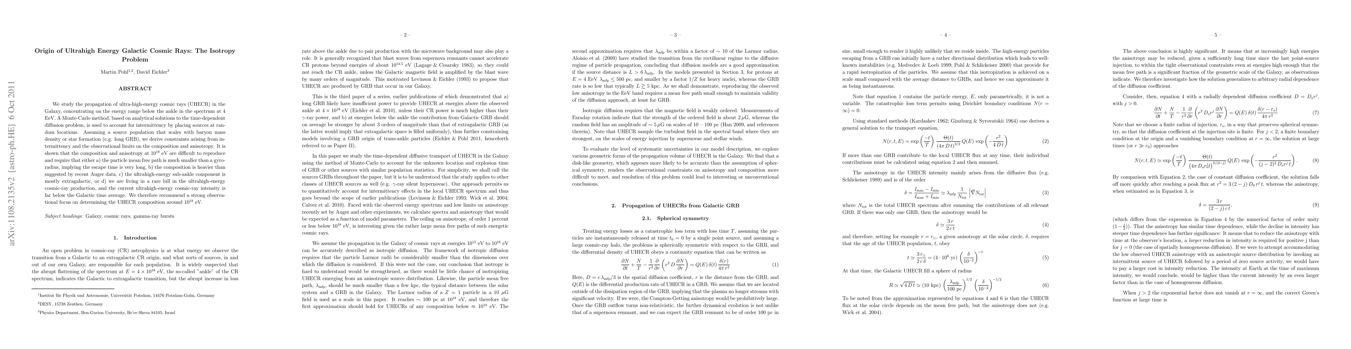 We study the propagation of ultra-high-energy cosmic rays (UHECR) in the Galaxy, concentrating on the energy range below the ankle in the spectrum at 4 EeV. A Monte-Carlo method, based on analytical solutions to the time-dependent diffusion problem, is used to account for intermittency by placing sources at random locations. Assuming a source population that scales with baryon mass density or star formation (e.g. long GRB), we derive constraints arising from intermittency and the observational limits on the composition and anisotropy. It is shown that the composition and anisotropy at 1e18 eV are difficult to reproduce and require that either a) the particle mean free path is much smaller than a gyroradius, implying the escape time is very long, b) the composition is heavier than suggested by recent Auger data, c) the ultrahigh-energy sub-ankle component is mostly extragalactic, or d) we are living in a rare lull in the ultrahigh-energy cosmic-ray production, and the current ultrahigh-energy cosmic-ray intensity is far below the Galactic time average. We therefore recommend a strong observational focus on determining the UHECR composition around 1e18 eV.