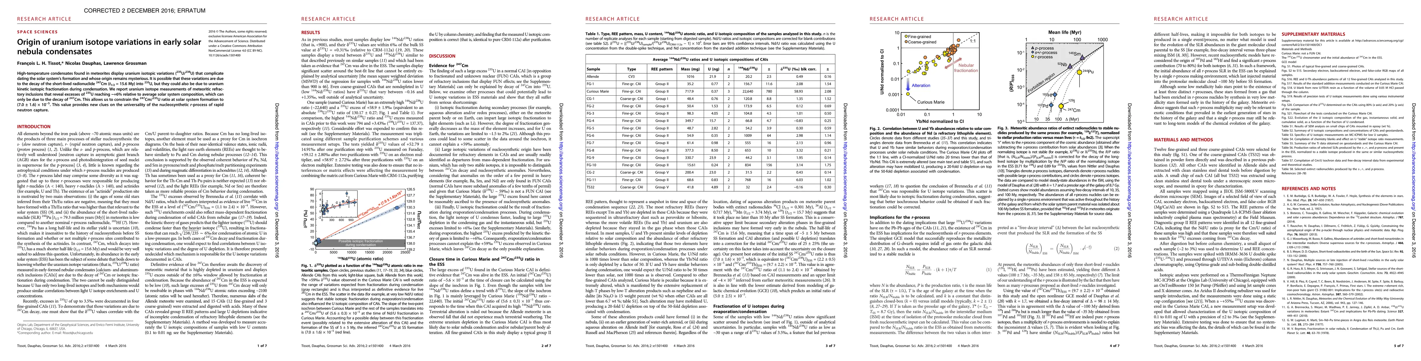 This research identifies uranium isotope variations in high-temperature meteorite condensates, attributing the excesses of 235U to the decay of the short-lived radionuclide 247Cm, thereby constraining the 247Cm/235U ratio at Solar System formation and offering insights into the nucleosynthetic r-process.