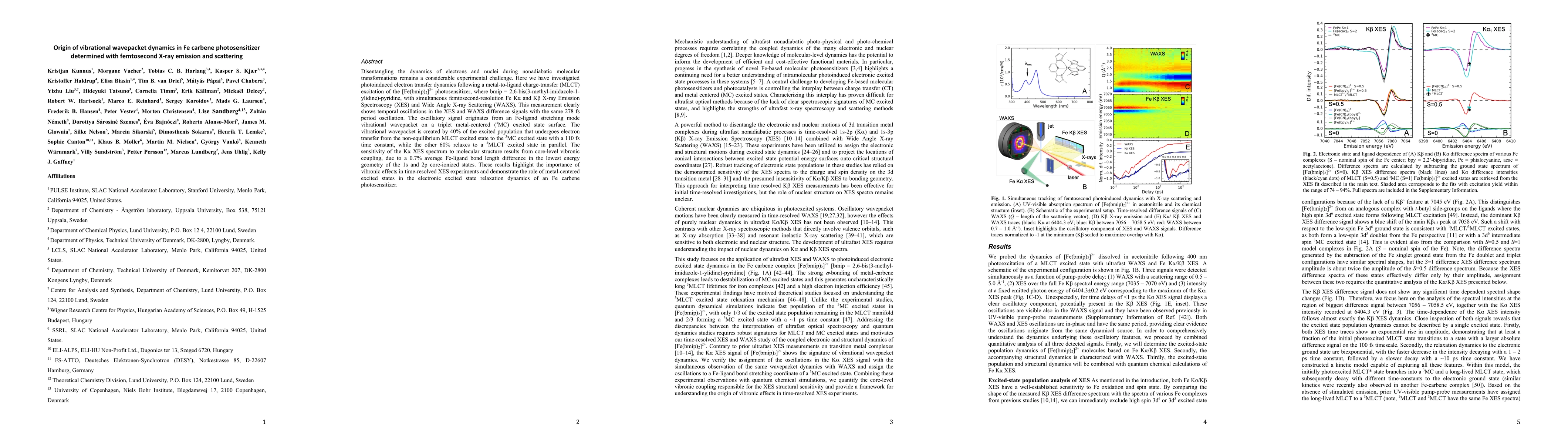 This study employs femtosecond X-ray emission and scattering to investigate the photoinduced electron transfer dynamics of an Fe carbene photosensitizer, revealing a 278 fs vibrational wavepacket oscillation originating from Fe-ligand stretching in a triplet metal-centered excited state. The findings underscore the significance of vibronic effects in the relaxation dynamics of metal-ligand charge-transfer excited states.