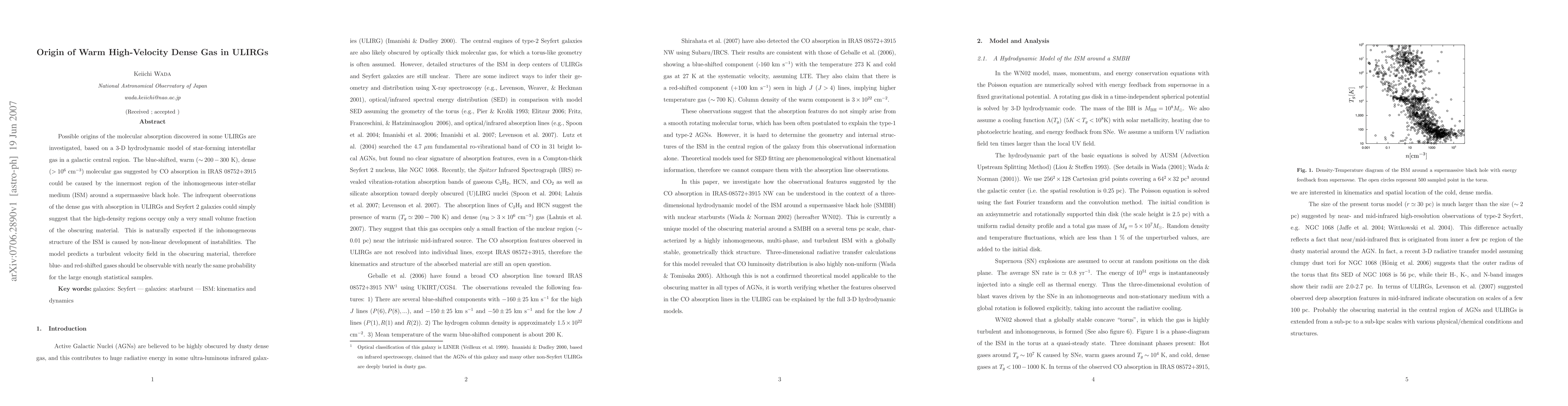 This paper explores the origin of warm, high-velocity, dense gas in ultra-luminous infrared galaxies (ULIRGs) using a 3-D hydrodynamic model. It suggests that the gas may originate from the inhomogeneous interstellar medium around a supermassive black hole, explaining the rare observations of such dense gas.