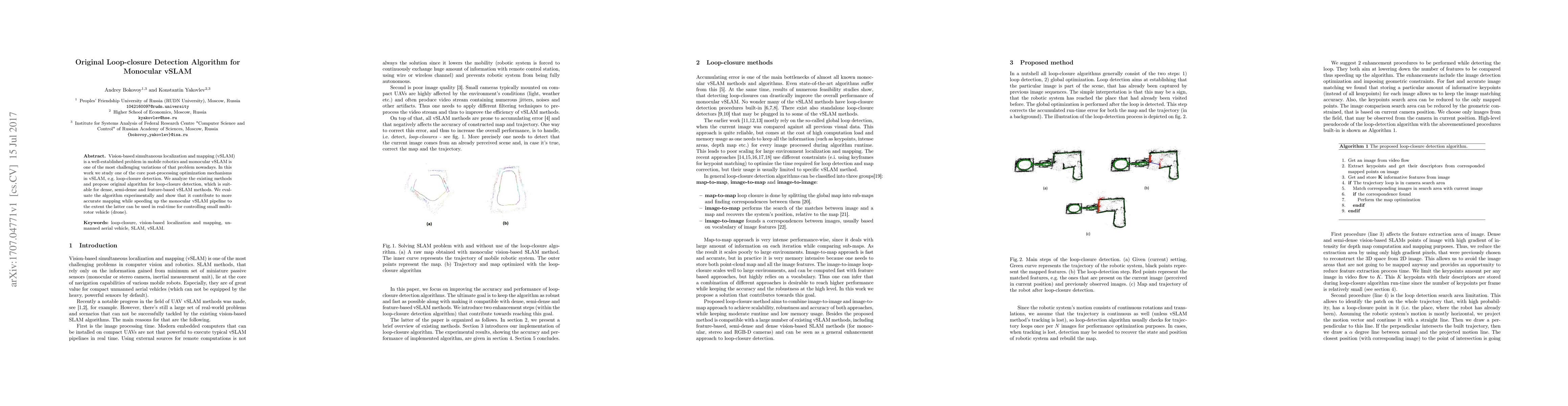 This paper proposes an original loop-closure detection algorithm for monocular vSLAM, enhancing the accuracy of mapping and enabling real-time application in small multi-rotor vehicles. Experimental evaluations demonstrate its effectiveness in dense, semi-dense, and feature-based vSLAM methods.