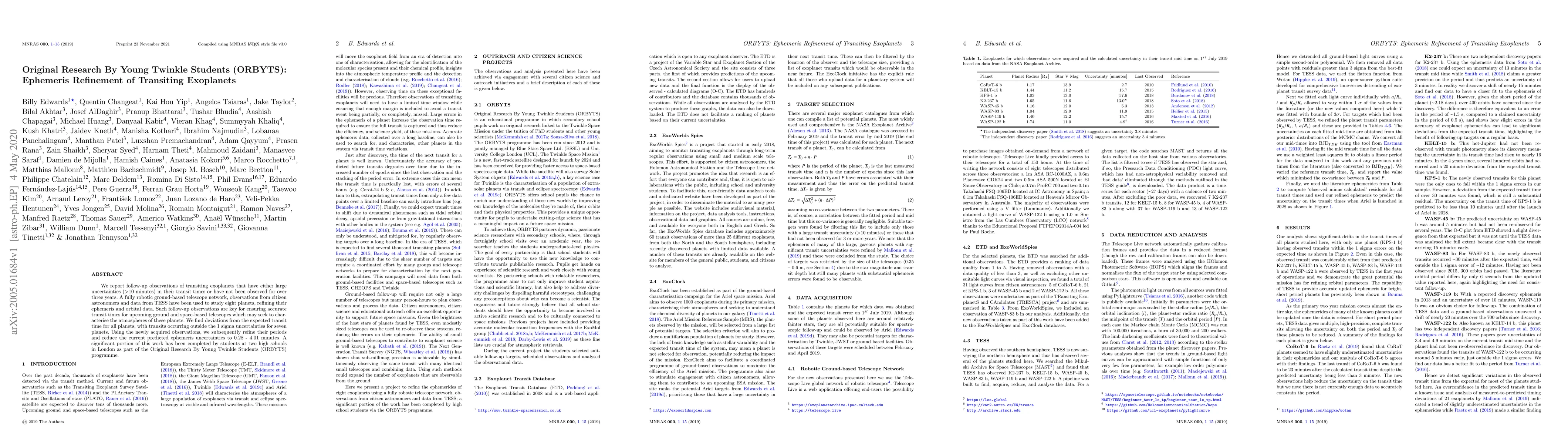 The research utilized a fully robotic ground-based telescope network, observations from citizen astronomers, and TESS data to conduct follow-up observations of transiting exoplanets with large uncertainties (>10 minutes) in their transit times or those not observed for over three years.