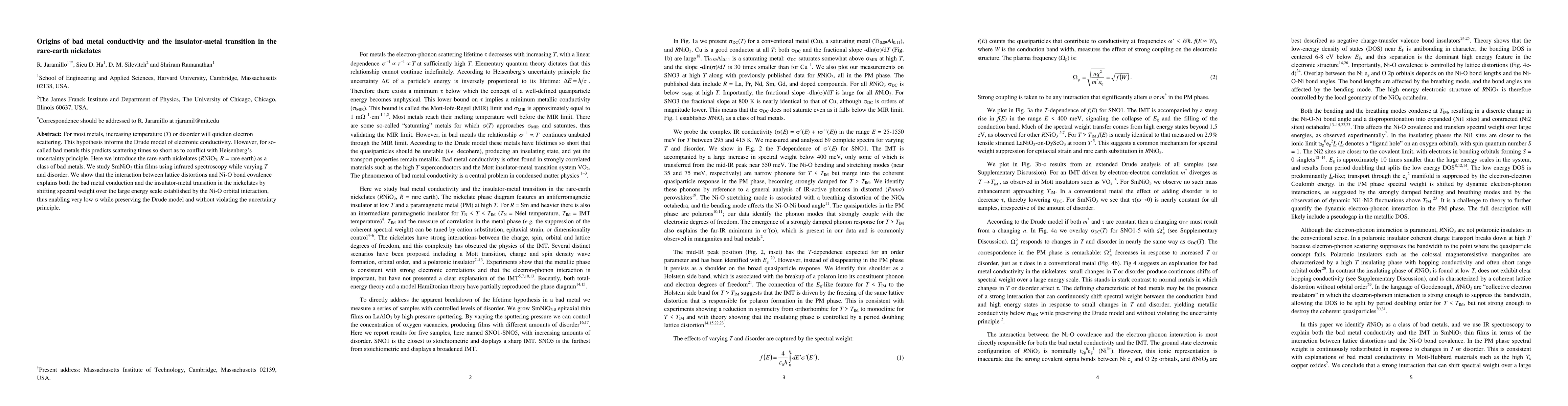 This paper investigates the unusual conductivity behavior of rare-earth nickelates (RNiO_3), termed "bad metals," where conventional scattering theories fail. The study reveals that lattice distortions and Ni-O bond covalence interactions drive both the bad metal conduction and the insulator-metal transition, without violating Heisenberg's uncertainty principle.