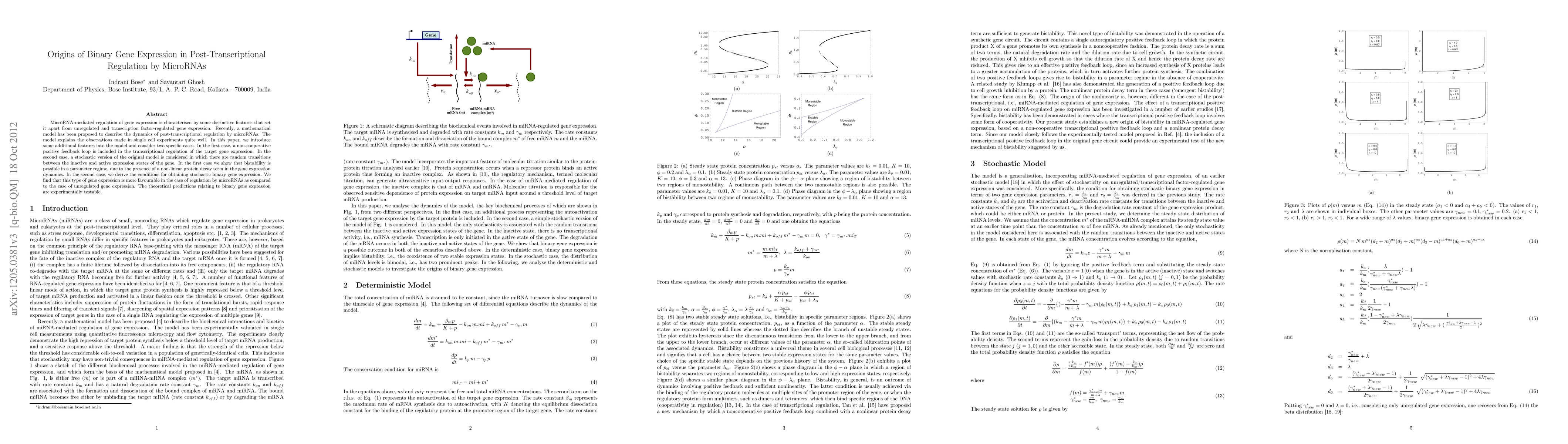 This paper enhances a mathematical model for microRNA-mediated post-transcriptional gene regulation, introducing non-cooperative positive feedback and stochasticity. It demonstrates that bistability and stochastic binary gene expression can occur, particularly under microRNA regulation, with theoretical predictions amenable to experimental validation.