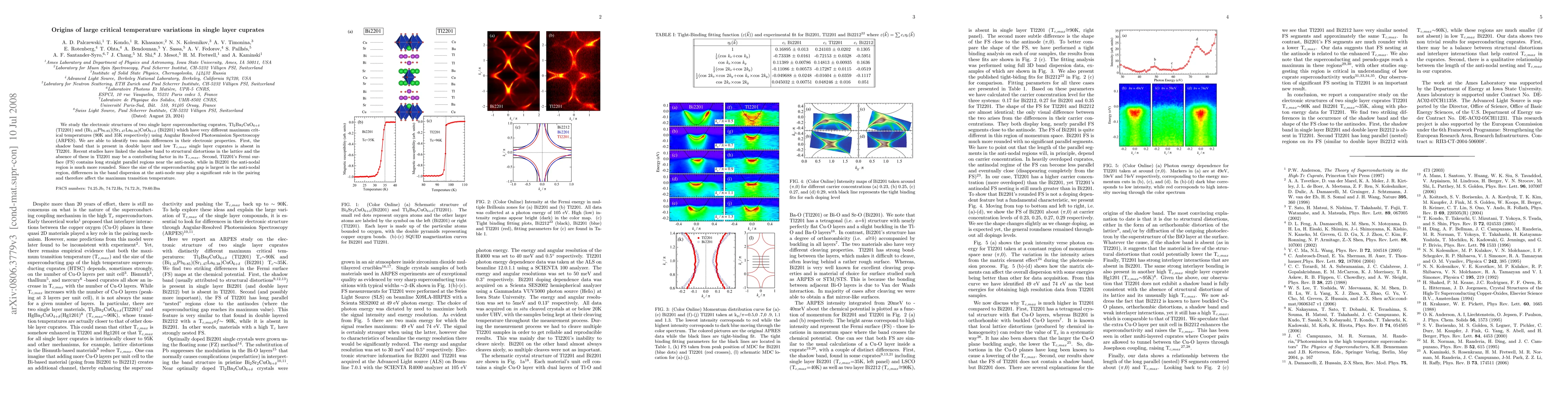 We study the electronic structures of two single layer superconducting cuprates, Tl$_2$Ba$_2$CuO$_{6+\delta}$ (Tl2201) and (Bi$_{1.35}$Pb$_{0.85}$)(Sr$_{1.47}$La$_{0.38}$)CuO$_{6+\delta}$ (Bi2201) which have very different maximum critical temperatures (90K and 35K respectively) using Angular Resolved Photoemission Spectroscopy (ARPES). We are able to identify two main differences in their electronic properties. First, the shadow band that is present in double layer and low T$_{c,max}$ single layer cuprates is absent in Tl2201. Recent studies have linked the shadow band to structural distortions in the lattice and the absence of these in Tl2201 may be a contributing factor in its T$_{c,max}$.Second, Tl2201's Fermi surface (FS) contains long straight parallel regions near the anti-node, while in Bi2201 the anti-nodal region is much more rounded. Since the size of the superconducting gap is largest in the anti-nodal region, differences in the band dispersion at the anti-node may play a significant role in the pairing and therefore affect the maximum transition temperature.