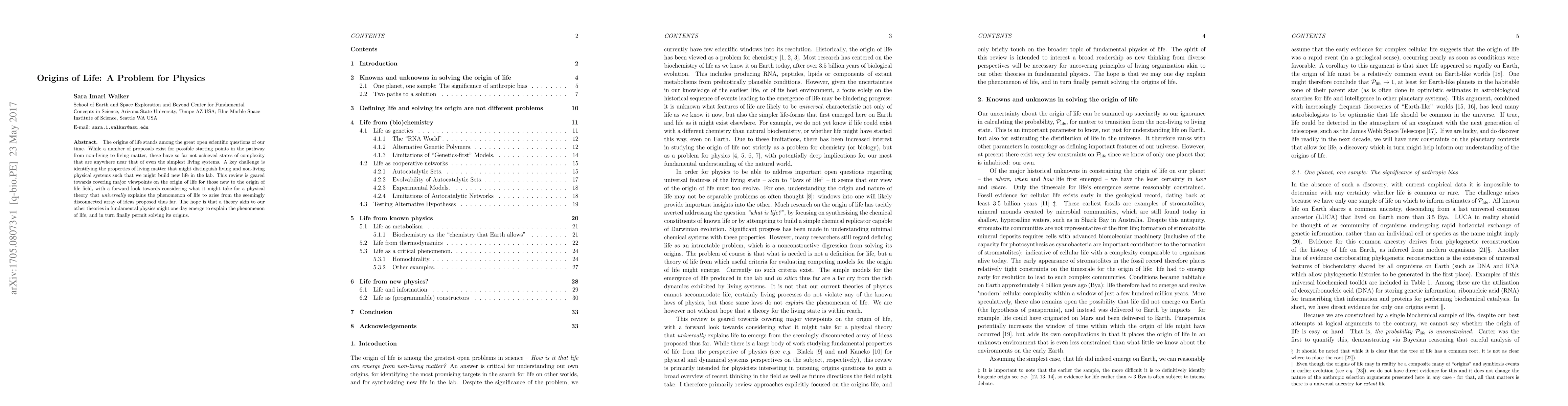 The origins of life stands among the great open scientific questions of our time. While a number of proposals exist for possible starting points in the pathway from non-living to living matter, these have so far not achieved states of complexity that are anywhere near that of even the simplest living systems. A key challenge is identifying the properties of living matter that might distinguish living and non-living physical systems such that we might build new life in the lab. This review is geared towards covering major viewpoints on the origin of life for those new to the origin of life field, with a forward look towards considering what it might take for a physical theory that universally explains the phenomenon of life to arise from the seemingly disconnected array of ideas proposed thus far. The hope is that a theory akin to our other theories in fundamental physics might one day emerge to explain the phenomenon of life, and in turn finally permit solving its origins.