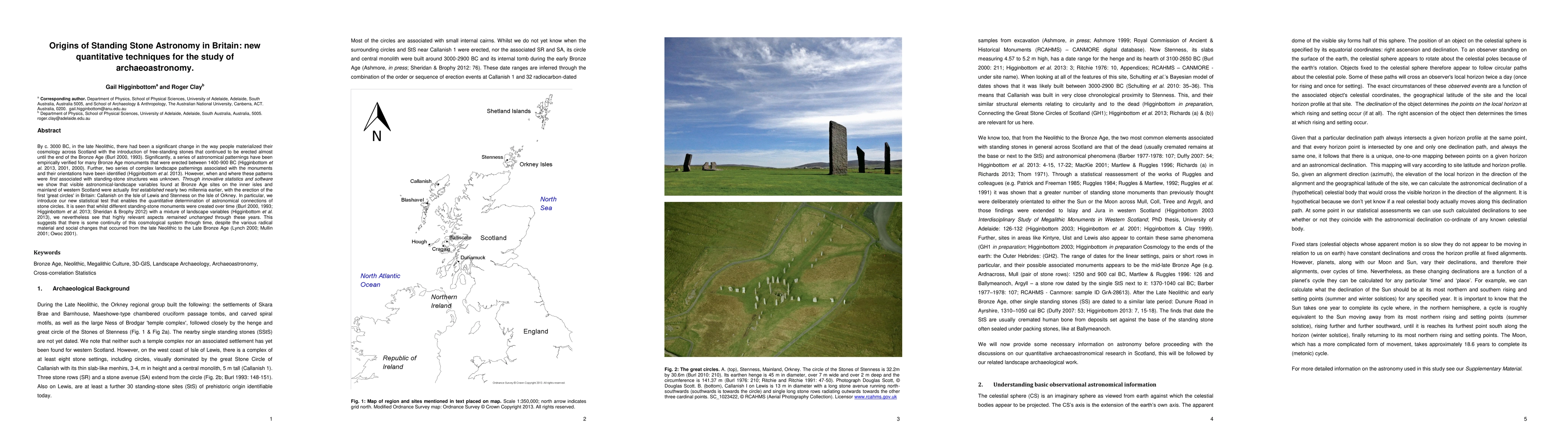 By c. 3000 BC, in the late Neolithic, there had been a significant change in the way people materialized their cosmology across Scotland with the introduction of free-standing stones. These were erected almost until the end of the Bronze Age (Burl 2000, 1993). Significantly, a series of astronomical patternings have been empirically verified for many Bronze Age monuments that were erected between 1400-900 BC (Higginbottom et 14 al. 2013, 2003, 2001, 2000). Further, two series of complex landscape patternings associated with the same monuments and their orientations have been identified (Higginbottom et al. 2013 & Higginbottom 'in preparation' - Bronze Age megalithic monuments on the isle of Mull). However, when and where these patterns were first associated with standing-stone structures was unknown. Through innovative statistics and software we show that visible astronomical-landscape variables found at Bronze Age sites on the inner isles and mainland of western Scotland were actually first established nearly two millennia earlier, with the erection of the first 'great circles' in Britain: Callanish on the Isle of Lewis and Stenness on the Isle of Orkney. In particular, we introduce our new statistical test that enables the quantitative determination of astronomical connections of stone circles. It is seen that, whilst different standing-stone monuments were created over time (Burl 2000, 1993; 22 Higginbottom et al. 2013; Sheridan & Brophy 2012) with a mixture of landscape variables (Higginbottom et al. 2013), there are nevertheless highly relevant aspects that remained unchanged through these years. This suggests that there is some continuity of this cosmological system through time, despite the various radical material and social changes that occurred from the late Neolithic to the Late Bronze Age (Lynch 2000; Mullin 26 2001; Owoc 2001).