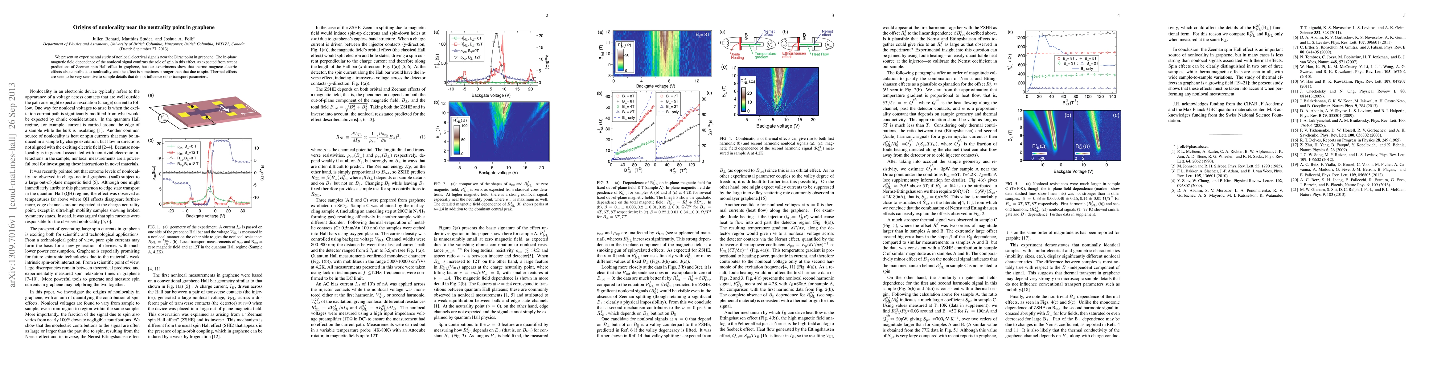 We present an experimental study of nonlocal electrical signals near the Dirac point in graphene. The in-plane magnetic field dependence of the nonlocal signal confirms the role of spin in this effect, as expected from recent predictions of Zeeman spin Hall effect in graphene, but our experiments show that thermo-magneto-electric effects also contribute to nonlocality, and the effect is sometimes stronger than that due to spin. Thermal effects are seen to be very sensitive to sample details that do not influence other transport parameters.