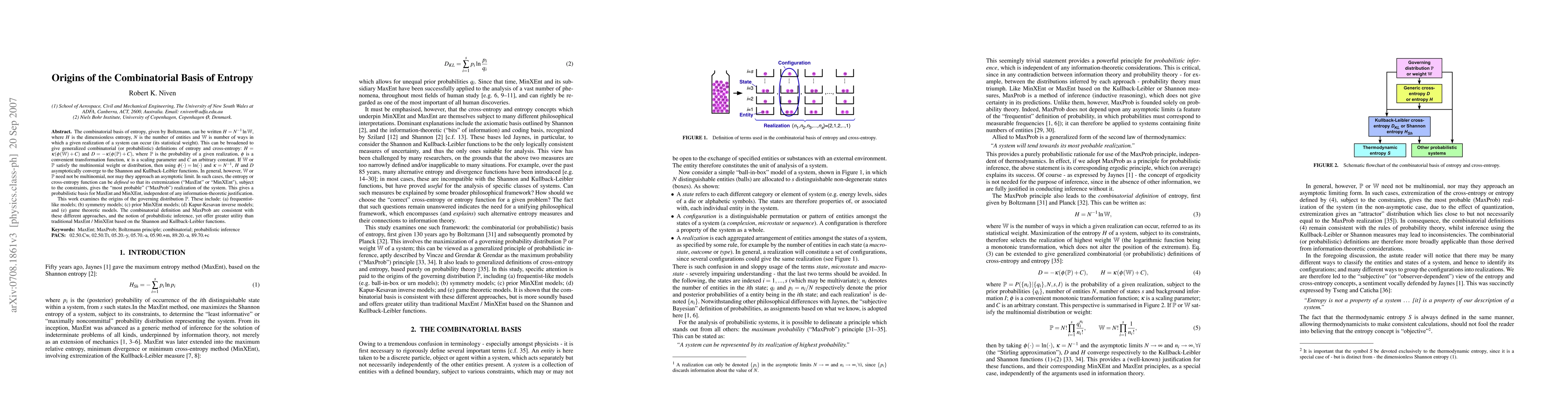 The combinatorial basis of entropy, given by Boltzmann, can be written $H = N^{-1} \ln \mathbb{W}$, where $H$ is the dimensionless entropy, $N$ is the number of entities and $\mathbb{W}$ is number of ways in which a given realization of a system can occur (its statistical weight). This can be broadened to give generalized combinatorial (or probabilistic) definitions of entropy and cross-entropy: $H=\kappa (\phi(\mathbb{W}) +C)$ and $D=-\kappa (\phi(\mathbb{P}) +C)$, where $\mathbb{P}$ is the probability of a given realization, $\phi$ is a convenient transformation function, $\kappa$ is a scaling parameter and $C$ an arbitrary constant. If $\mathbb{W}$ or $\mathbb{P}$ satisfy the multinomial weight or distribution, then using $\phi(\cdot)=\ln(\cdot)$ and $\kappa=N^{-1}$, $H$ and $D$ asymptotically converge to the Shannon and Kullback-Leibler functions. In general, however, $\mathbb{W}$ or $\mathbb{P}$ need not be multinomial, nor may they approach an asymptotic limit. In such cases, the entropy or cross-entropy function can be {\it defined} so that its extremization ("MaxEnt'' or "MinXEnt"), subject to the constraints, gives the ``most probable'' (``MaxProb'') realization of the system. This gives a probabilistic basis for MaxEnt and MinXEnt, independent of any information-theoretic justification. This work examines the origins of the governing distribution $\mathbb{P}$.... (truncated)