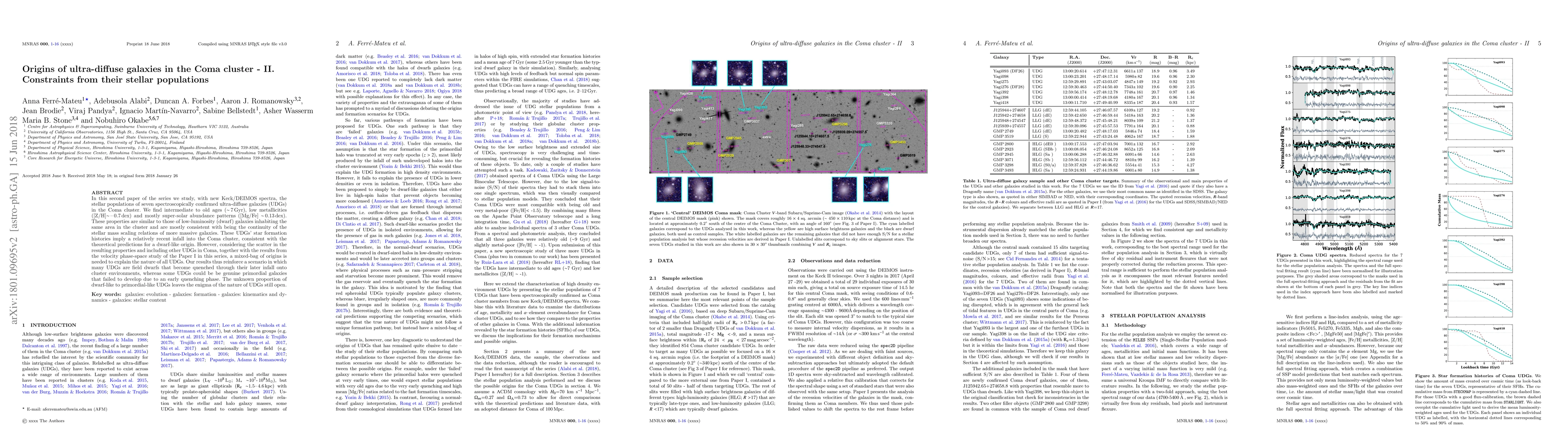 This paper analyzes the stellar populations of seven ultra-diffuse galaxies (UDGs) in the Coma cluster, finding them to be intermediate-aged, low-metallicity, and mostly super-solar in abundance patterns. These properties suggest a mixed origin for UDGs, with some likely being field dwarfs that became quenched after infalling into the cluster, while others may be primordial galaxies that failed to develop due to early quenching.