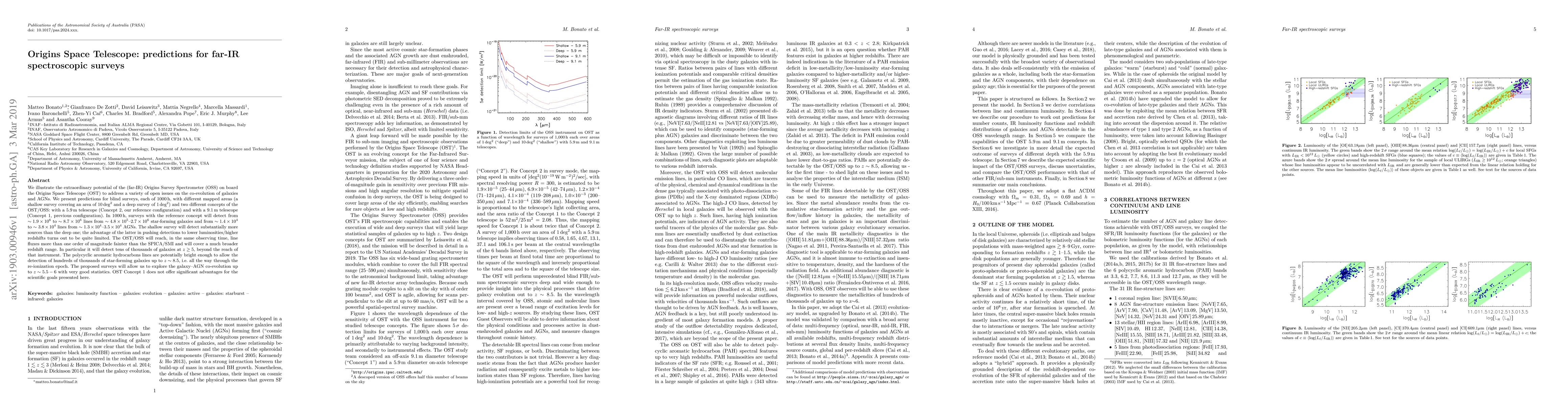 We illustrate the extraordinary potential of the (far-IR) Origins Survey Spectrometer (OSS) on board the Origins Space Telescope (OST) to address a variety of open issues on the co-evolution of galaxies and AGNs. We present predictions for blind surveys, each of 1000 h, with different mapped areas (a shallow survey covering an area of 10 deg$^{2}$ and a deep survey of 1 deg$^{2}$) and two different concepts of the OST/OSS: with a 5.9 m telescope (Concept 2, our reference configuration) and with a 9.1 m telescope (Concept 1, previous configuration). In 1000 h, surveys with the reference concept will detect from $\sim 1.9 \times 10^{6}$ to $\sim 8.7 \times 10^{6}$ lines from $\sim 4.8 \times 10^{5}$-$2.7 \times 10^{6}$ star-forming galaxies and from $\sim 1.4 \times 10^{4}$ to $\sim 3.8 \times 10^{4}$ lines from $\sim 1.3 \times 10^{4}$-$3.5 \times 10^{4}$ AGNs. The shallow survey will detect substantially more sources than the deep one; the advantage of the latter in pushing detections to lower luminosities/higher redshifts turns out to be quite limited. The OST/OSS will reach, in the same observing time, line fluxes more than one order of magnitude fainter than the SPICA/SMI and will cover a much broader redshift range. In particular it will detect tens of thousands of galaxies at $z \geq 5$, beyond the reach of that instrument. The polycyclic aromatic hydrocarbons lines are potentially bright enough to allow the detection of hundreds of thousands of star-forming galaxies up to $z \sim 8.5$, i.e. all the way through the re-ionization epoch. The proposed surveys will allow us to explore the galaxy-AGN co-evolution up to $z\sim 5.5-6$ with very good statistics. OST Concept 1 does not offer significant advantages for the scientific goals presented here.