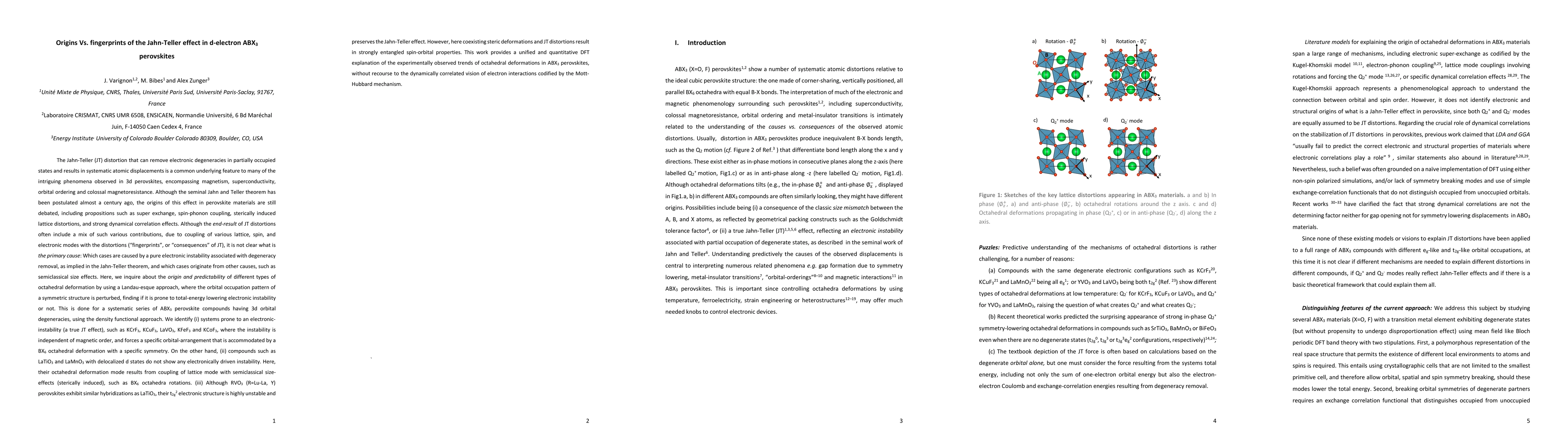 The Jahn-Teller (JT) distortion that can remove electronic degeneracies in partially occupied states and results in systematic atomic displacements is a common underlying feature to many of the intriguing phenomena observed in 3d perovskites, encompassing magnetism, superconductivity, orbital ordering and colossal magnetoresistance. Although the seminal Jahn and Teller theorem has been postulated almost a century ago, the origins of this effect in perovskite materials are still debated, including propositions such as super exchange, spin-phonon coupling, sterically induced lattice distortions, and strong dynamical correlation effects. Here we analyze the driving forces behind the Jahn-Teller motions and associated electronic fingerprints in a full range of ABX3 compounds. We identify (i) compounds that are prone to an electronically-driven instabilities (i.e. a pure JT effect) such as KCrF3, KCuF3 or LaVO3 and proceed to relax the structures, finding quantitatively the JTD in excellent agreement with experiment; (ii) compounds such as LaMnO3 or LaTiO3 that do not show electronically driven JTD despite orbital degeneracies, because their strongly hybridized B, d-X, p states supply but too weak JT forces to overcome the needed atomic distortions; (iii) although LaVO3 exhibits similar B, d-X, p hybridizations as LaTiO3, the former compound exhibits a robust electronic instability while LaTiO3 has zero stabilization energy, the reason being that LaVO3 has two electrons t2g2 relative to LaTiO3 with just one t2g1. (iv) We explain the trends in "orbital ordering" whereby electrons occupy orbitals that point to orthogonal directions between all nearest-neighbor 3d atoms. We thereby provide a unified vision to explain octahedra deformations in perovskites that, at odds with common wisdom, does not require the celebrated Mott-Hubbard mechanism.