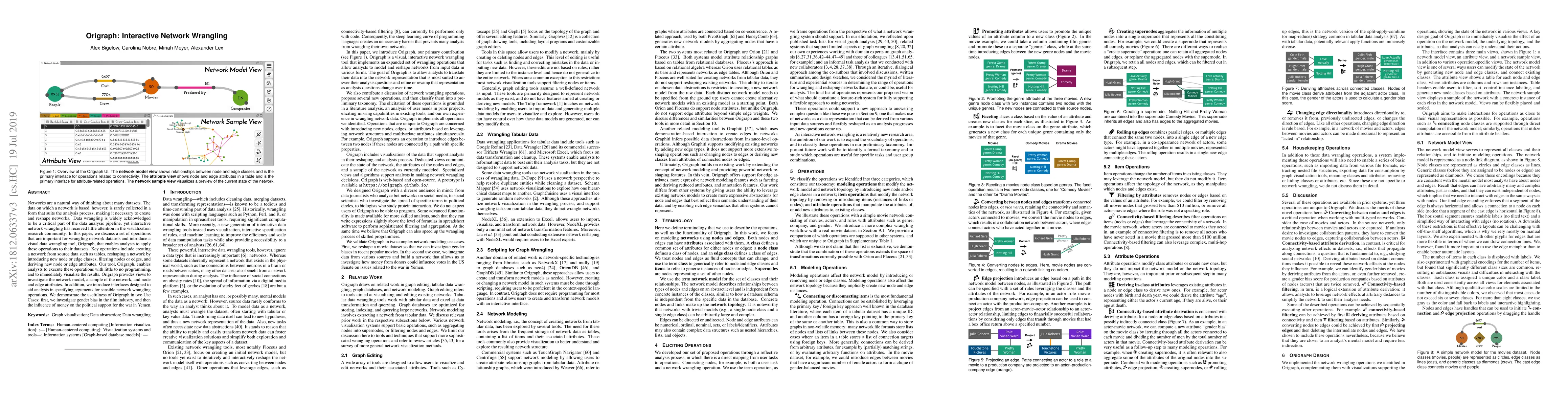 Networks are a natural way of thinking about many datasets. The data on which a network is based, however, is rarely collected in a form that suits the analysis process, making it necessary to create and reshape networks. Data wrangling is widely acknowledged to be a critical part of the data analysis pipeline, yet interactive network wrangling has received little attention in the visualization research community. In this paper, we discuss a set of operations that are important for wrangling network datasets and introduce a visual data wrangling tool, Origraph, that enables analysts to apply these operations to their datasets. Key operations include creating a network from source data such as tables, reshaping a network by introducing new node or edge classes, filtering nodes or edges, and deriving new node or edge attributes. Our tool, Origraph, enables analysts to execute these operations with little to no programming, and to immediately visualize the results. Origraph provides views to investigate the network model, a sample of the network, and node and edge attributes. In addition, we introduce interfaces designed to aid analysts in specifying arguments for sensible network wrangling operations. We demonstrate the usefulness of Origraph in two Use Cases: first, we investigate gender bias in the film industry, and then the influence of money on the political support for the war in Yemen.