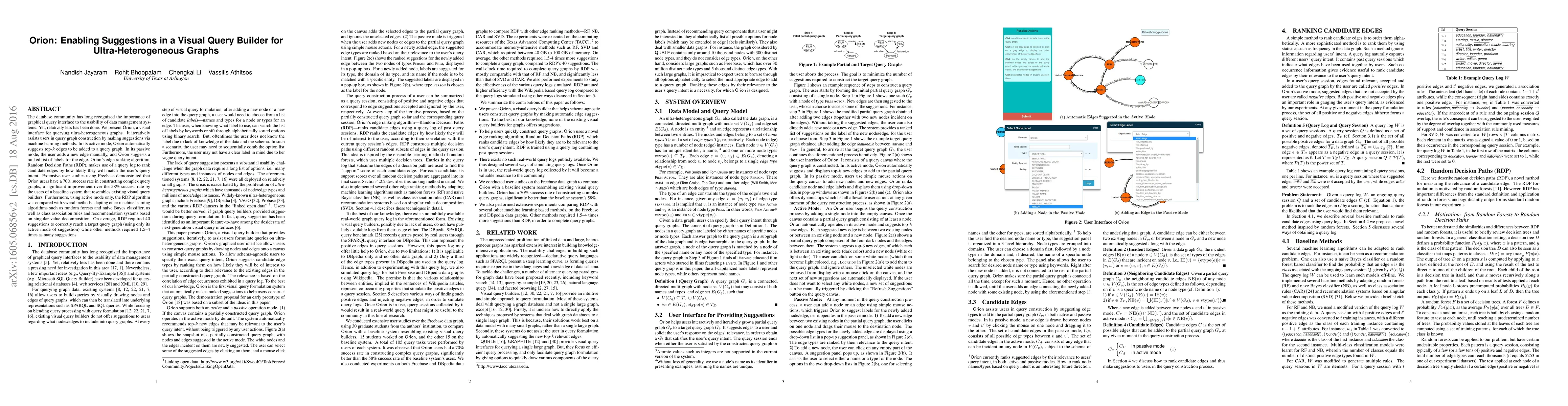 The database community has long recognized the importance of graphical query interface to the usability of data management systems. Yet, relatively less has been done. We present Orion, a visual interface for querying ultra-heterogeneous graphs. It iteratively assists users in query graph construction by making suggestions via machine learning methods. In its active mode, Orion automatically suggests top-k edges to be added to a query graph. In its passive mode, the user adds a new edge manually, and Orion suggests a ranked list of labels for the edge. Orion's edge ranking algorithm, Random Decision Paths (RDP), makes use of a query log to rank candidate edges by how likely they will match the user's query intent. Extensive user studies using Freebase demonstrated that Orion users have a 70% success rate in constructing complex query graphs, a significant improvement over the 58% success rate by the users of a baseline system that resembles existing visual query builders. Furthermore, using active mode only, the RDP algorithm was compared with several methods adapting other machine learning algorithms such as random forests and naive Bayes classifier, as well as class association rules and recommendation systems based on singular value decomposition. On average, RDP required 40 suggestions to correctly reach a target query graph (using only its active mode of suggestion) while other methods required 1.5--4 times as many suggestions.