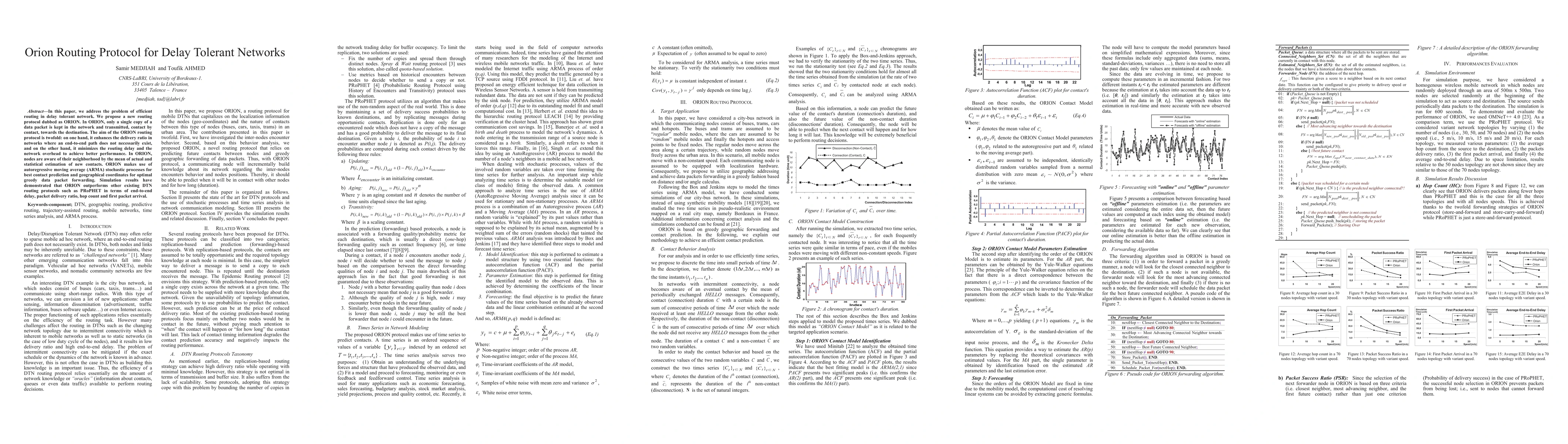 A new routing protocol, dubbed as ORION, was proposed for mobile delay tolerant networks.