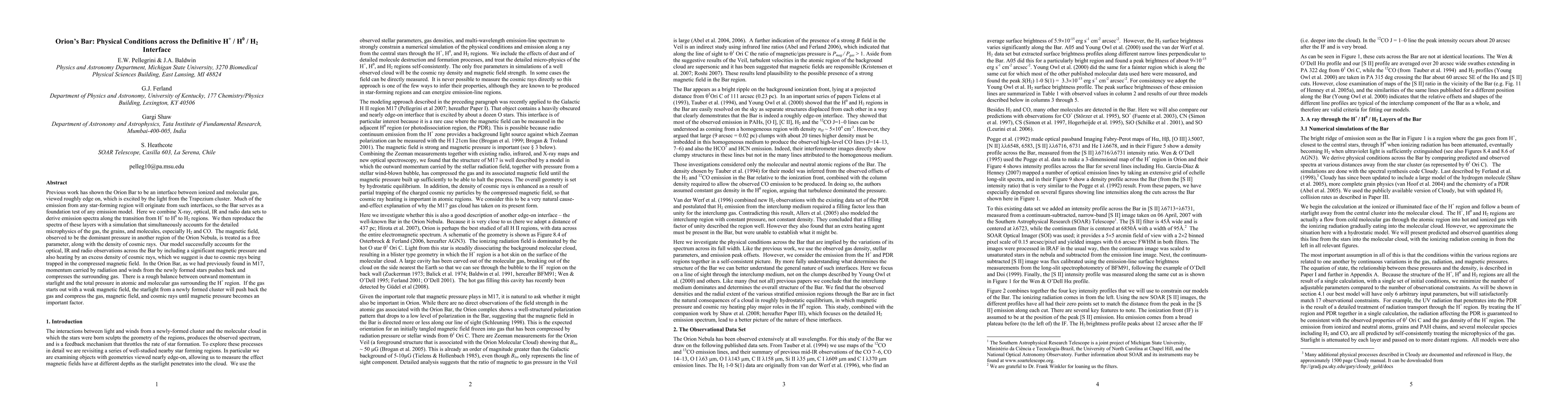 Previous work has shown the Orion Bar to be an interface between ionized and molecular gas, viewed roughly edge on, which is excited by the light from the Trapezium cluster. Much of the emission from any star-forming region will originate from such interfaces, so the Bar serves as a foundation test of any emission model. Here we combine X-ray, optical, IR and radio data sets to derive emission spectra along the transition from H+ to H0 to H2 regions. We then reproduce the spectra of these layers with a simulation that simultaneously accounts for the detailed microphysics of the gas, the grains, and molecules, especially H2 and CO. The magnetic field, observed to be the dominant pressure in another region of the Orion Nebula, is treated as a free parameter, along with the density of cosmic rays. Our model successfully accounts for the optical, IR and radio observations across the Bar by including a significant magnetic pressure and also heating by an excess density of cosmic rays, which we suggest is due to cosmic rays being trapped in the compressed magnetic field. In the Orion Bar, as we had previously found in M17, momentum carried by radiation and winds from the newly formed stars pushes back and compresses the surrounding gas. There is a rough balance between outward momentum in starlight and the total pressure in atomic and molecular gas surrounding the H+ region. If the gas starts out with a weak magnetic field, the starlight from a newly formed cluster will push back the gas and compress the gas, magnetic field, and cosmic rays until magnetic pressure becomes an important factor.