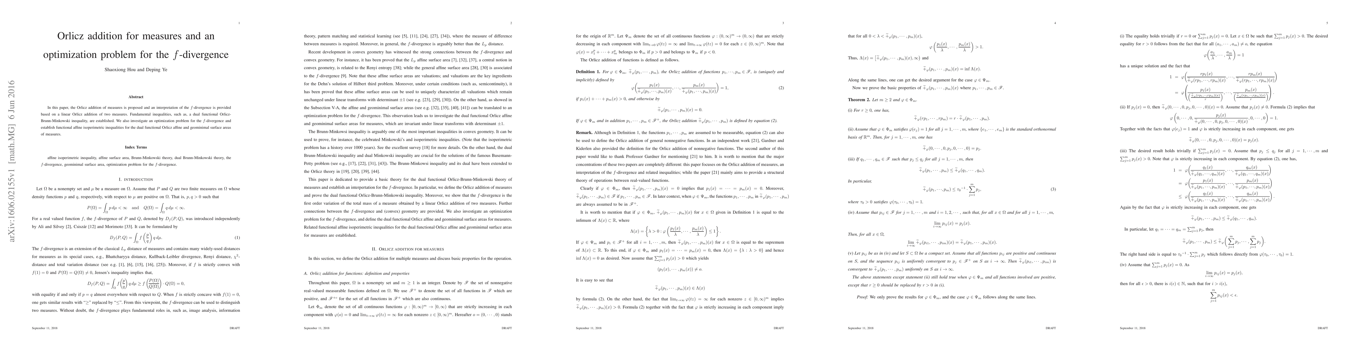 In this paper, the Orlicz addition of measures is proposed and an interpretation of the $f$-divergence is provided based on a linear Orlicz addition of two measures. Fundamental inequalities, such as, a dual functional Orlicz-Brunn-Minkowski inequality, are established. We also investigate an optimization problem for the $f$-divergence and establish functional affine isoperimetric inequalities for the dual functional Orlicz affine and geominimal surface areas of measures.