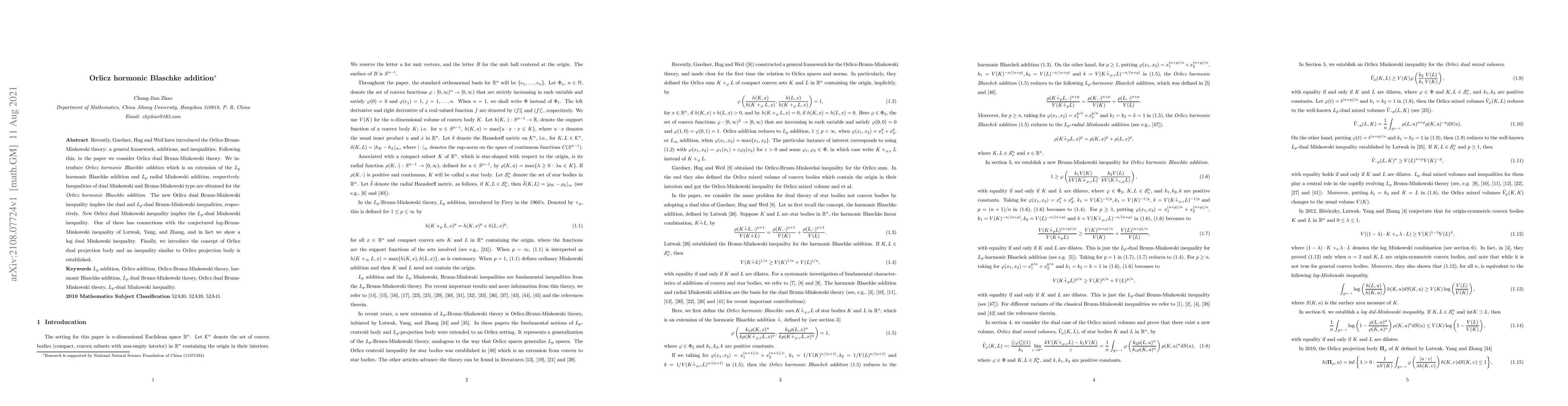 Recently, Gardner, Hug and Weil have introduced the Orlicz-Brunn-Minkowski theory: a general framework, additions, and inequalities. Following this, in the paper we consider Orlicz dual Brunn-Minkowski theory. We introduce Orlicz hormonic Blaschke addition which is an extension of the Lp hormonic Blaschke addition and L p radial Minkowski addition, respectively. Inequalities of dual Minkowski and Brunn-Minkowski type are obtained for the Orlicz hormonic Blaschke addition. The new Orlicz dual Brunn-Minkowski inequality implies the dual and L p -dual Brunn-Minkowski inequalities, respectively. New Orlicz dual Minkowski inequality implies the L p -dual Minkowski inequality. One of these has connections with the conjectured log-Brunn-Minkowski inequality of Lutwak, Yang, and Zhang, and in fact we show a log dual Minkowski inequality. Finally, we introduce the concept of Orlicz dual projection body and an inequality similar to Orlicz projection body is established.