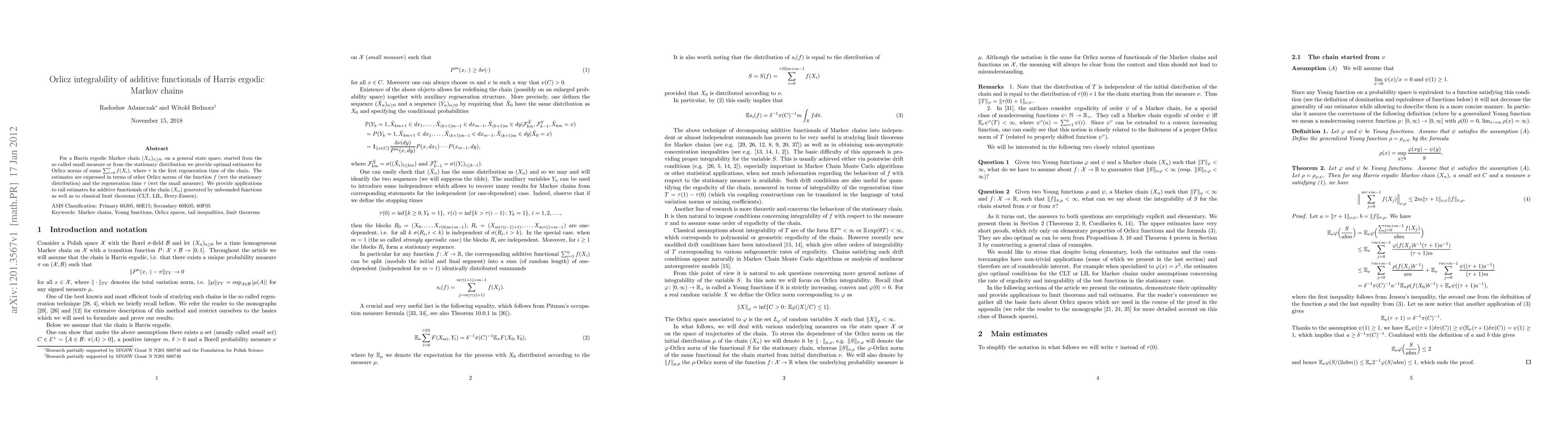 For a Harris ergodic Markov chain $(X_n)_{n\ge 0}$, on a general state space, started from the so called small measure or from the stationary distribution we provide optimal estimates for Orlicz norms of sums $\sum_{i=0}^\tau f(X_i)$, where $\tau$ is the first regeneration time of the chain. The estimates are expressed in terms of other Orlicz norms of the function $f$ (wrt the stationary distribution) and the regeneration time $\tau$ (wrt the small measure). We provide applications to tail estimates for additive functionals of the chain $(X_n)$ generated by unbounded functions as well as to classical limit theorems (CLT, LIL, Berry-Esseen).